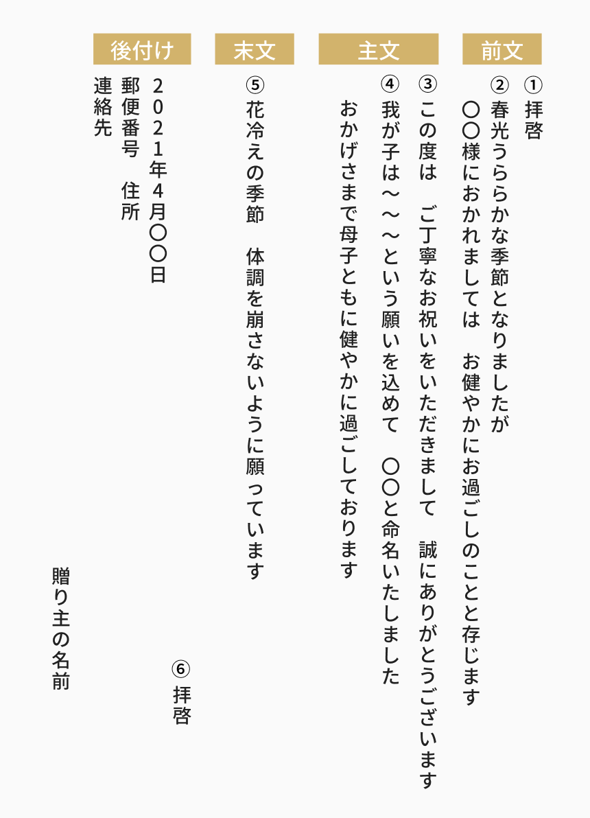 拝啓 初蝶の姿を見かけ本格的な春の到来を嬉しく感じております いかがお過ごしでしょうか 先日は長男○○の出産にあたり 素敵なお祝い品をいただきありがとうございました さっそく親子そろって愛用させていただいております 子どもは〜〜〜(名前の由来)という願いをこめまして 「◯◯」(ふりがな)と命名しました また おかげさまで母子ともに健康に過ごしております 初めてのことばかりでまだ不慣れな2人ですが 大学以来の友人としてこれからもアドバイスをいただければ幸いです ぜひ一度 息子の顔を見に立ち寄ってくださいね 末筆ながらますますのご活躍をお祈り申し上げます 令和○年○月○日