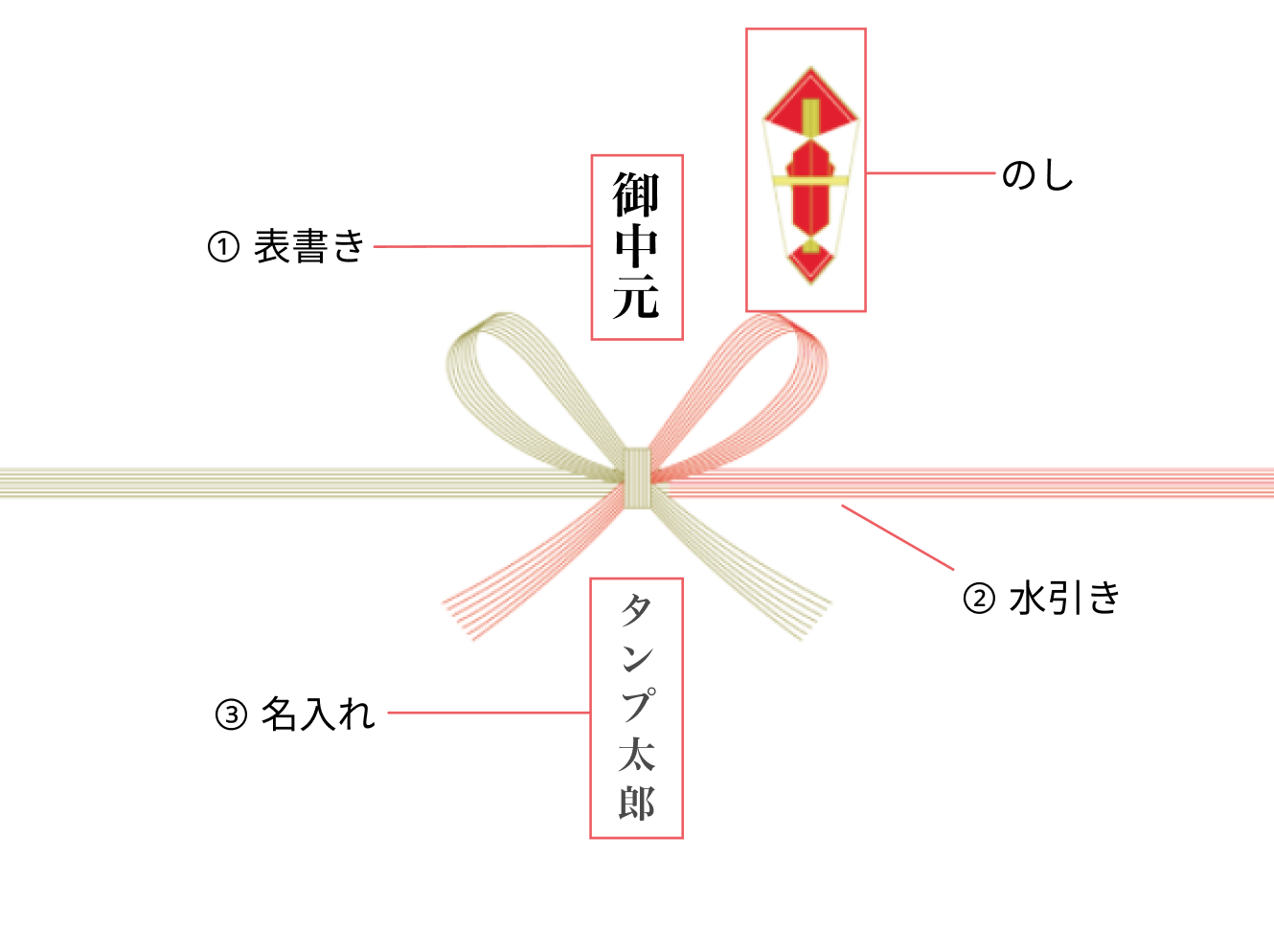 実際にお中元を贈る際は、のし(熨斗)が欠かせません。 のしをかける時は、まず表に「御中元」または「お中元」と書きましょう。 その際ボールペンや万年筆を避け、筆ペンや黒の太いペンで書くようにしましょう。 また色が薄いと弔事の薄墨を連想させるので、濃い青や黒など見やすい色がいいでしょう。 贈り主として自分の名前を記載する時は、名目より少し小さくすることを意識してください。3人以上の場合は送り主の中で一番偉い方や年長の方の名前を中央に書き左に続けて書きます。 まとめて書く際は代表者を中央に書き、左に「外一同」と記入しましょう。 また配送したり控えめに送りたい時は直接のしをかける「内のし」、感謝を強く表したい時は包装紙の上からかける「外のし」にしてみてください。 最後に結ぶ水引きは、蝶々結びが基本になります。