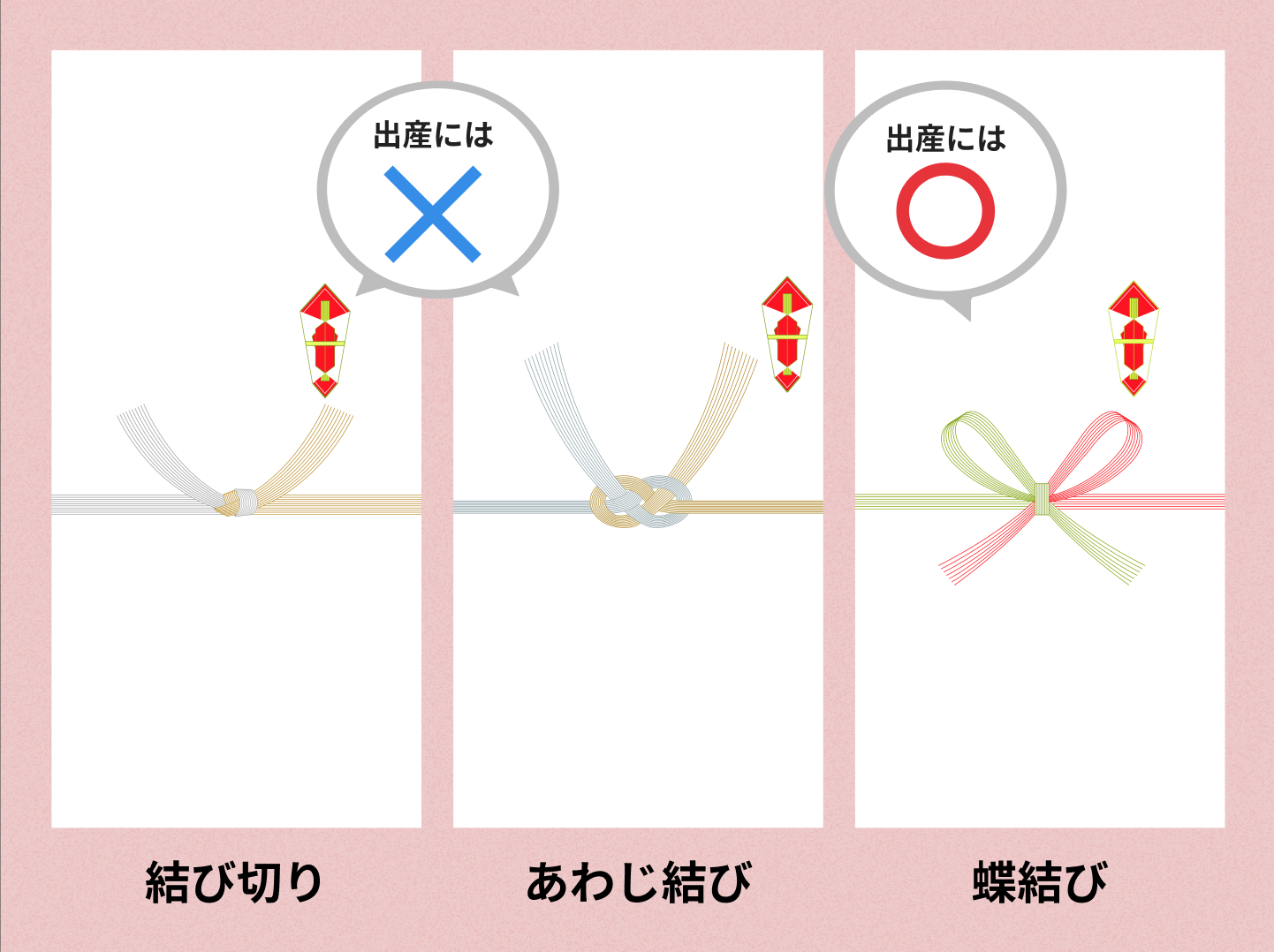 ご祝儀袋や「のし」には、「水引」という飾りひもがついています(図②)。この水引にも、色や本数、結び方などのマナーがあります。市販の祝儀袋や「のし」には、すでに所定の水引がついていることが多いですが、本来のマナーも覚えておくと役立つでしょう。 出産祝いの水引は、色は「紅白」、本数は「5本」、結び方は「蝶結び(花結び)」となります。 お祝い事の水引としては、紅白5本のものが最もオールマイティです。「蝶結び(花結び)」の結び方は、ほどいて何度でも結び直せることから、「人生で何度でも起きてほしい、おめでたいこと」に対して使われます。