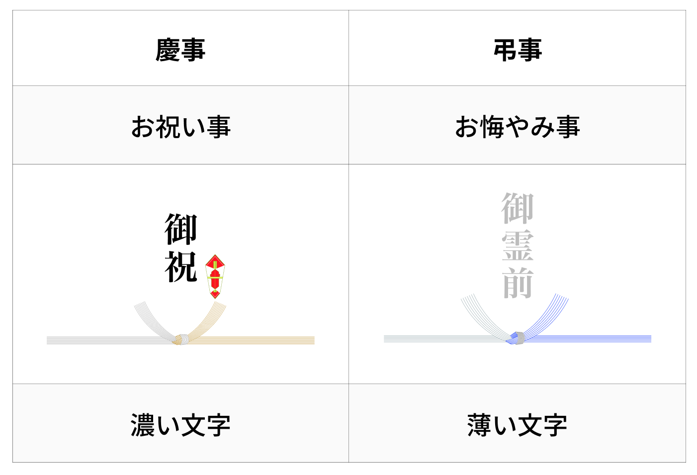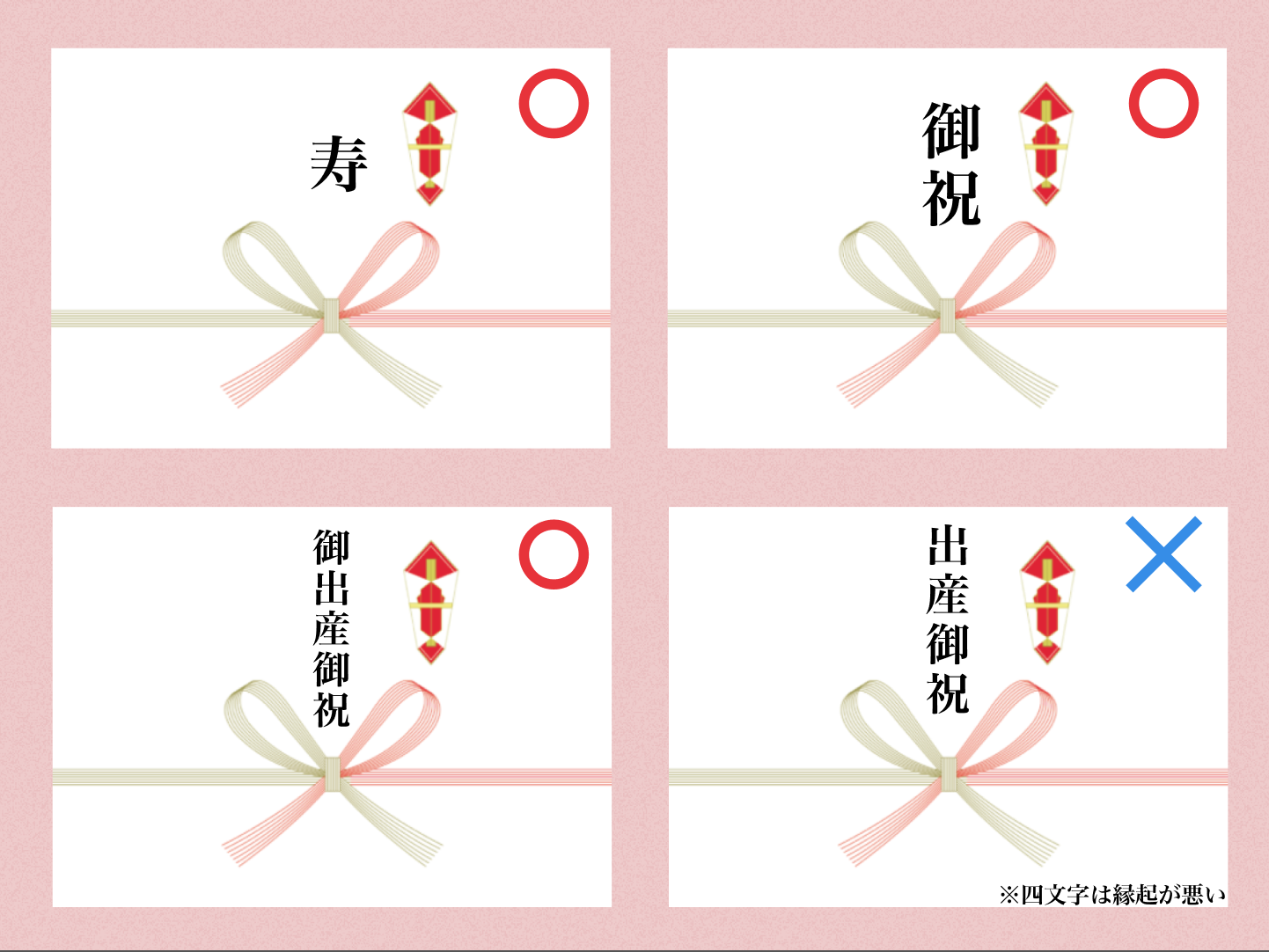 水引の上には、「表書き」と呼ばれる、贈り物の名目を書きます(①)。 表書きには特有の文言が使われますが、出産祝いの場合は「御出産御祝」「御祝」といった文言がおすすめです。 自分で表書きを書く場合は、スペースに合わせて中央に大きめに書くようにしましょう。 ※「出産御祝」と書くこともできますが、これは「死文字」といって縁起が悪く、気にされる方もいます。避けるのが無難ですが、その他二行にするといった対処法も存在します。