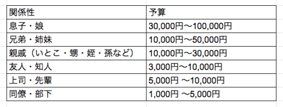 ここからは、出産祝いの品物の選び方についてご紹介します。 贈り物を選ぶとき、まず決めたいのが「予算」。いくらぐらいのギフトを贈ればよいか悩むかもしれませんが、出産祝いの金額の相場は下記のようになります。