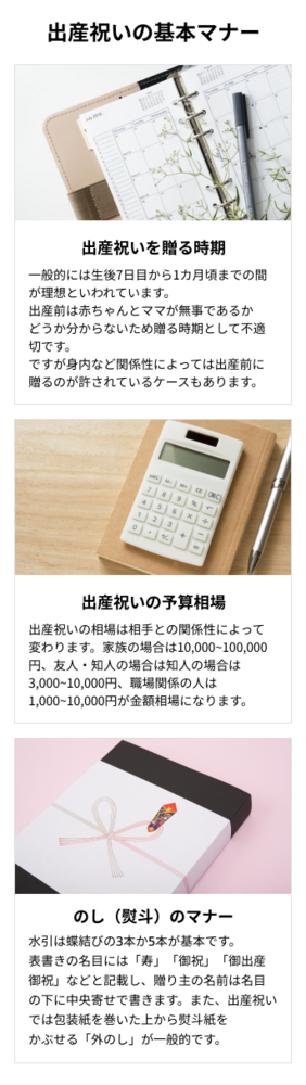 ここで注意しておきたいのは、出産祝いには避けたほうがよい品物があること。 下記のような品は、お祝い事全般には不向きだったり、産後には不適切だったりするため、贈るのは避けたほうがよいでしょう。 ×包丁やナイフなど:「(縁が)切れる」を連想させるため ×鏡やガラスなど:「割れる」を連想させ縁起がよくないため ×櫛など:「苦(く)」や「死(し)」を連想させるため ×アルコールやカフェインなど:ママが授乳中の場合は飲用できないため いずれも、ママからのリクエストがあった場合は贈っても差し支えないでしょう。