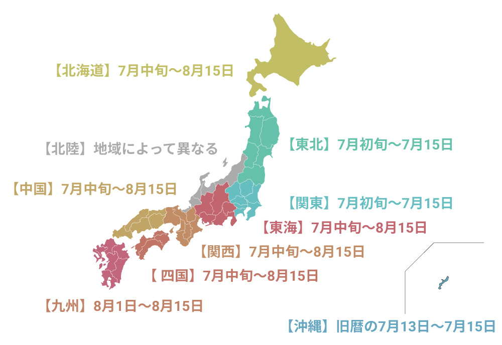 お中元を贈る時期は、地域によって異なります。 基本的に東日本は【7月上旬〜15日】、西日本は【7月中旬〜8月15日】の間に贈るのが良いでしょう。 大まかには上記のように分けられますが、東日本、西日本の中でも少しずつ贈る時期に違いがあります。 【東北・関東】7月初旬〜7月15日 【北陸】地域によって分かれる 【北海道・東海・関西・中国・四国】7月中旬〜8月15日 【九州】8月1日〜8月15日 【沖縄】旧暦の7月13日〜7月15日