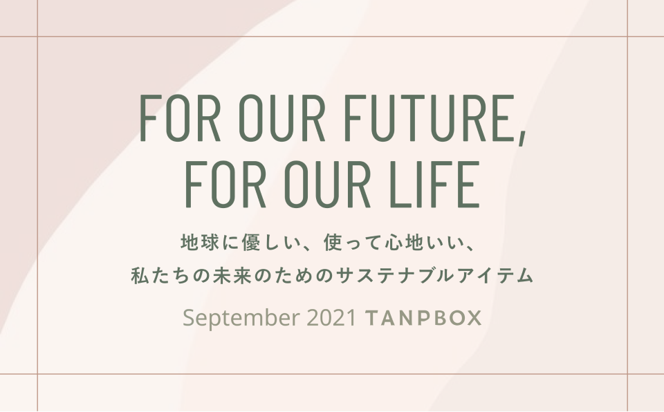TANP BOX9月号テーマは、 ------------------ FOR OUR FUTURE, FOR OUR LIFE - 地球に優しい、使って心地いい、私たちの未来のためのサステナブルアイテム - ------------------ 最近、耳にしない日はない、「サステナブル」という言葉。 地球環境を大切にしながら、誰もが平和に、豊かに生活をし続けていける社会を、全世界で目指そうとしています。 来月のTANP BOXでは、私たちの生活や未来のためを考えられて開発されたサスティナブル商品をお届けしました。 商品地球や人、動物などすべてのものに配慮した、使って心地のいいアイテムたちです。 朝起きて、歯を磨いて、化粧をして...そんな日常の中で、お気に入りのサスティナブル商品を見つけて取り入れてみませんか?
