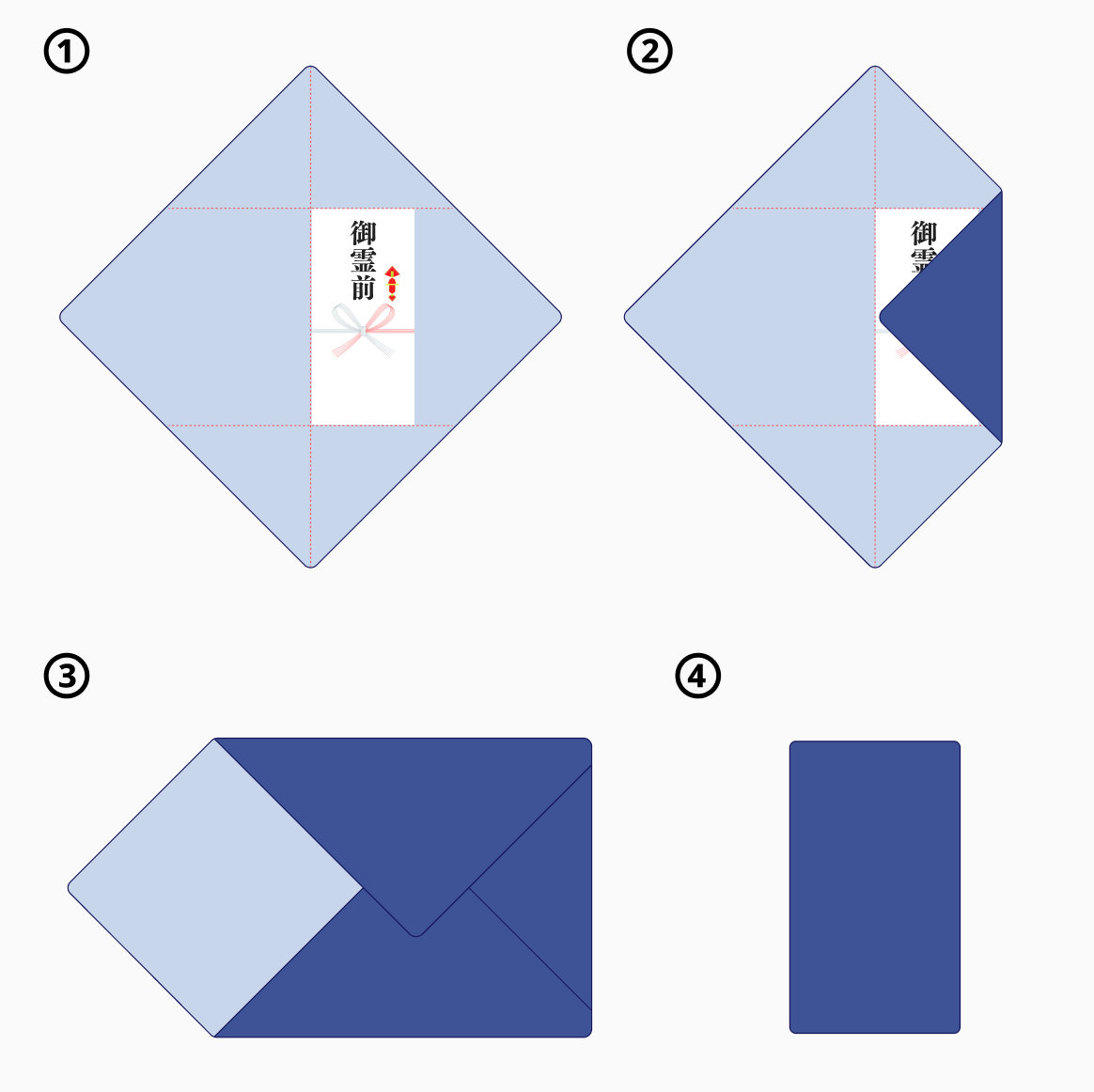 1. ふくさを開いて、ひし形になるように置きます。 爪付きタイプの場合は、爪が右にくるようにします。 2. ふくさの中央から少し右にご祝儀袋を置きます。 台付きふくさでリバーシブルタイプの場合は、寒色系の面を表に向けて置いて、その上にご祝儀袋をのせます。 3. ふくさの「右→下→上→左」の順に畳みます。 4. はみ出た部分は裏に折り込み、爪付きタイプの場合は留め糸にひっかけて完成です。