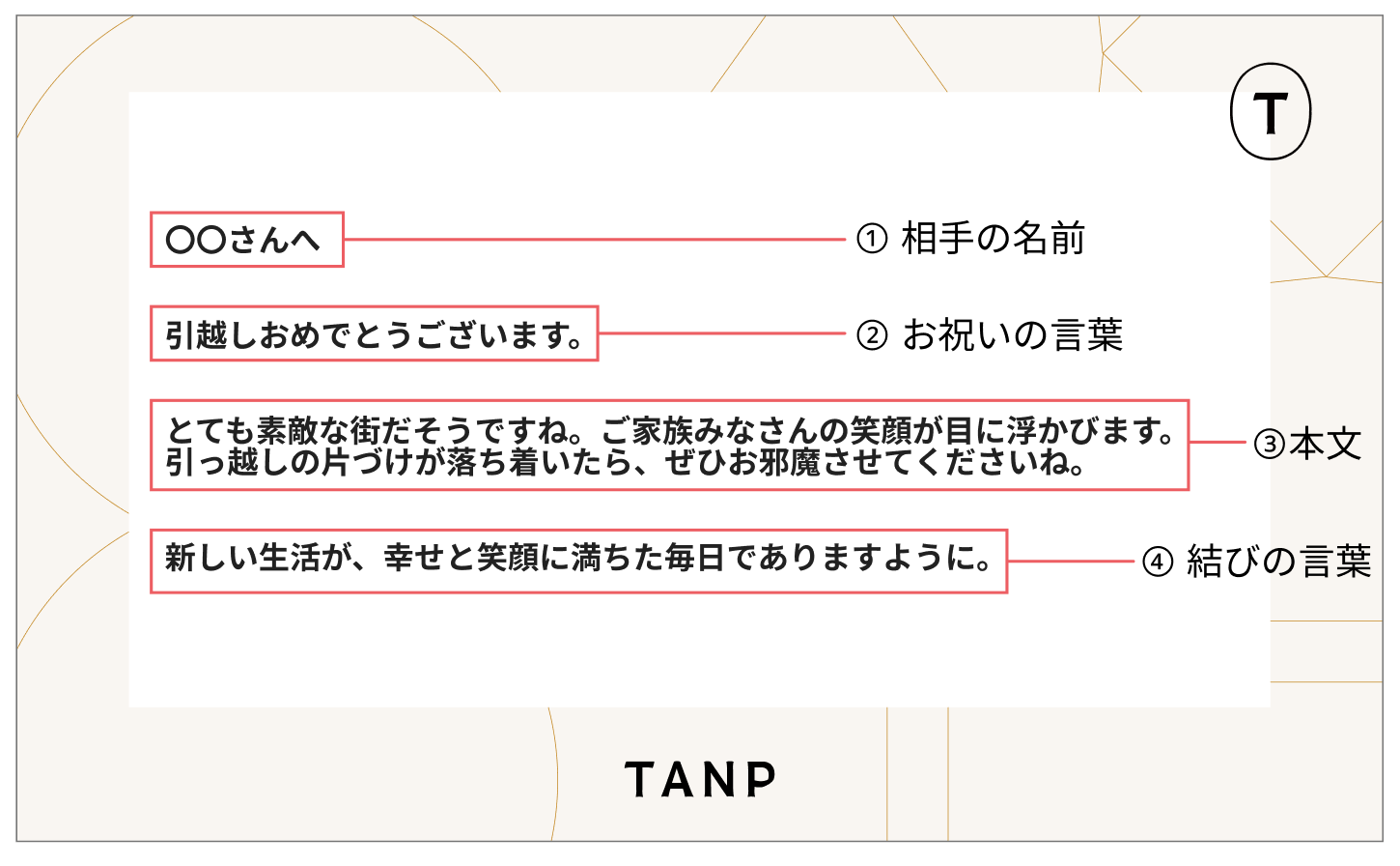 実際に引っ越し祝いのメッセージを書くとなると、その内容に悩んでしまいますよね。 そこでここからは、お相手の方に喜んでいただけるあいさつ状の内容をご紹介します。