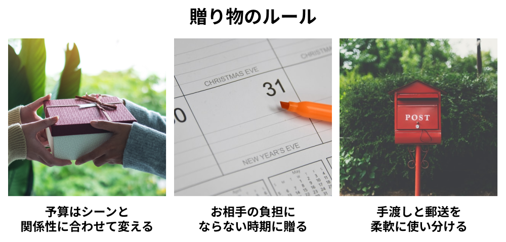 予算に相場があるように、「ギフトを贈る時期」についても一般的なマナーが存在します。 例えば、「引っ越し祝いは、転居直後の忙しい時期には贈らない」「出産祝いは、出産後に母子の無事を確認できてから贈る」など、贈る時期にまつわるマナーはギフトのシーンによってさまざま。 ギフトを贈るときは、贈る時期のマナーも確認し、お相手の負担にならない時期を意識して贈るようにしましょう。