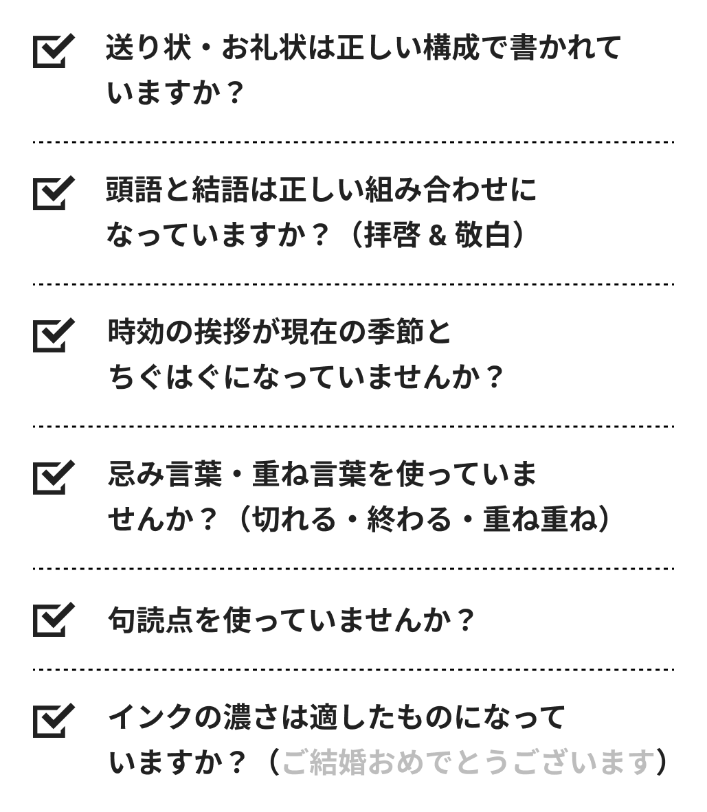 送り状やお礼状を書くときには、気をつけたいルールがいくつかあります。 ●忌み言葉・重ね言葉に注意する 「切れる」「消える」「終わる」「なくなる」といった言葉は「忌み言葉」と呼ばれ、縁起が悪い言葉とされているため、メッセージには使わないよう気をつけましょう。 また、「ますます」「返す返す」「たびたび」「重ね重ね」といった「重ね言葉」も、何度も繰り返したくない結婚祝いや弔事などではタブーとされています。 ●句読点は使用しない 句読点(、や。)は「区切り」や「終わり」を意味することから、おめでたいことの終わりを示唆するとされ、特にお祝い事の文章では使用を避けるというルールがあります。 お悔み事の文章においても、「儀式が滞りなく行われるように」という意味を込めて、句読点を避けるとよいとされています。 句読点の代わりに、空白や改行を用いてメッセージを書くようにしましょう。 ●インクの濃さに気をつける お祝い事では、黒や濃いブルーなど濃い色のインクでメッセージを書きましょう。逆に、葬儀や法事などのお悔み事では、薄墨を使って文章を書くのが正しいマナーです。