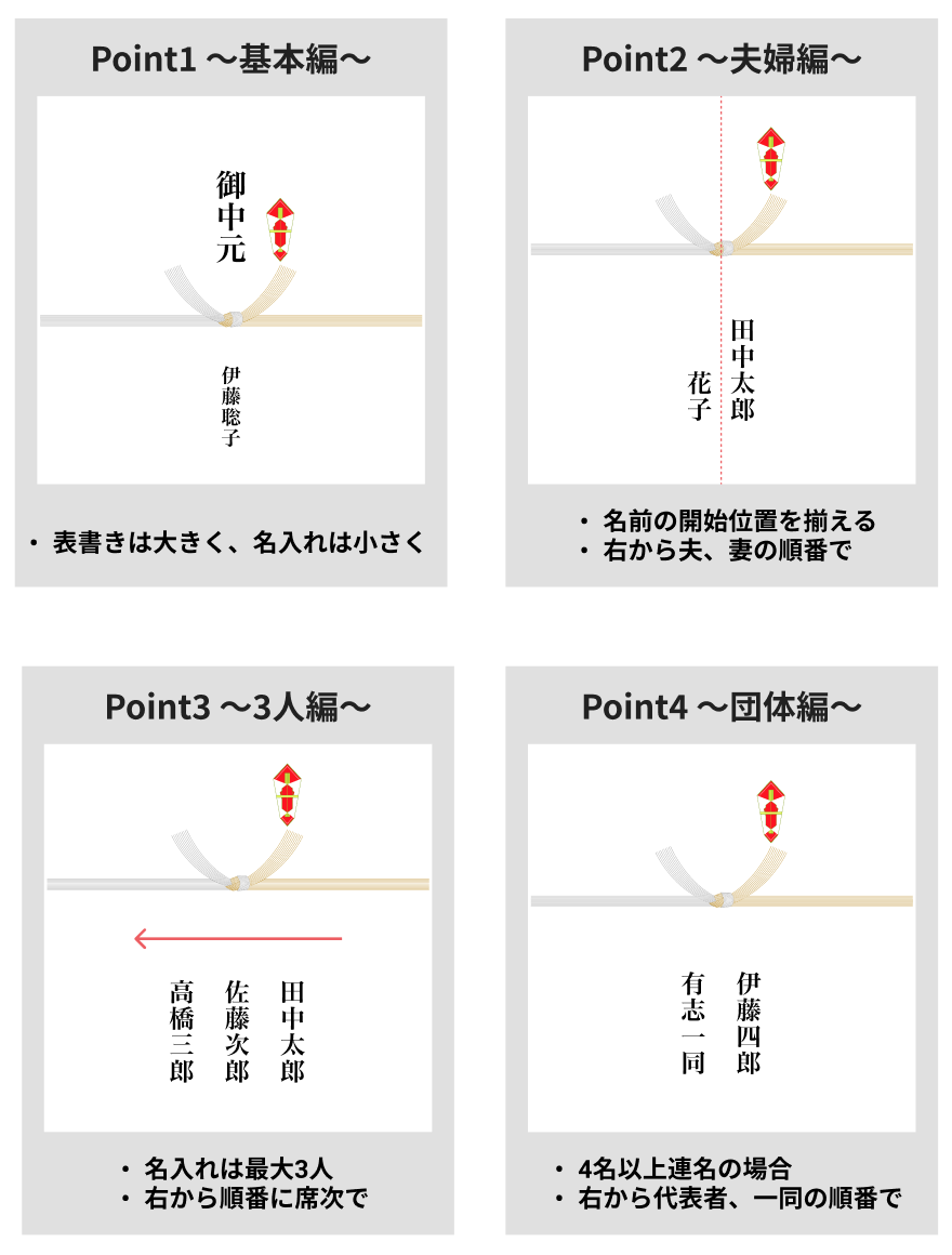 【名入れ】は水引の結び目の下の、贈り主の名前を書く部分を指します。 名入れを書くときは、表書きよりも小さい文字で書くとバランスが良くなります。 名入れの書き方は、贈り主の人数などによって異なります。 贈り主が1名の場合は、中央にフルネームを記入しましょう。 2名以上や夫婦などで贈る場合は、下記のルールを参考にしてくださいね。 ・2~3名で贈るとき 代表者の氏名を中央に書き、その左側に他の方の氏名を、年齢順や五十音順などで書いていきます。 ・夫婦で贈るとき 夫の氏名を中央に書き、妻の名前をその左側に、名字なしで書きます。 別姓の場合はそれぞれのフルネームを並べて書きましょう。 ・4名以上で贈るとき 贈り主の人数が4名以上になるときは、全員の氏名は書きません。代表者の氏名を中央に書き、その左側に「外一同」などと書きましょう。 その場合、全員の氏名は奉書紙(和紙)などにまとめて記入し、お中元に同梱するのが丁寧な贈り方となります。 ・会社で贈るとき ①社名を「株式会社○○」などと中央に書く ②社名と代表者の氏名を「株式会社○○」「代表取締役 ○○」などと2列で書く ③社名と部署名などを「株式会社○○」「○○部一同」などと2列で書く といった方法があります。