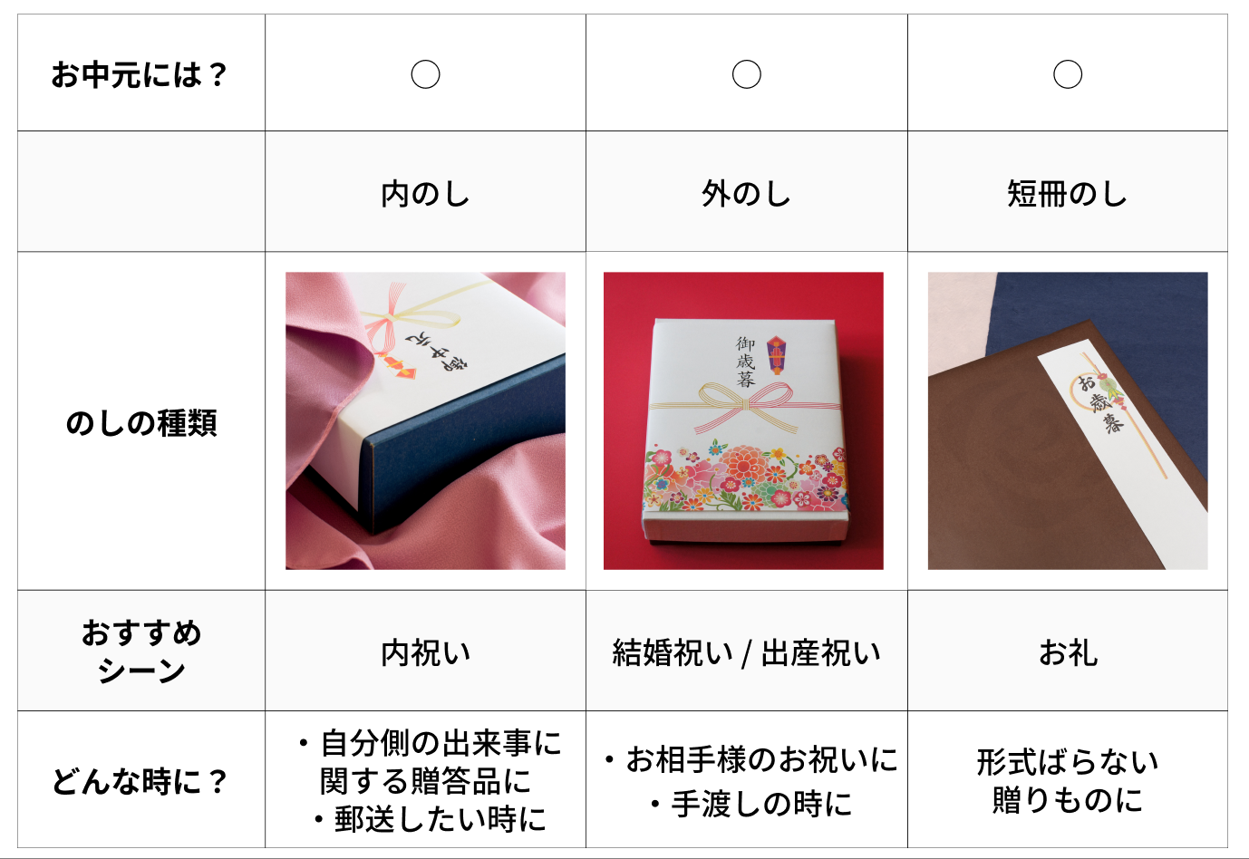 ギフトに「のし紙」をかけるときは、【内のし】と【外のし】の2種のかけ方があります。ここでは、お中元での使い分け方を説明しましょう。 ・内のし 品物の箱などに直接「のし紙」をかけて、その上から包装紙で包む方法。 お中元を発送で贈る場合は、配送中に「のし紙」が破れたり汚れたりしないよう、内のしで贈るのがおすすめです。 また、内のしは「のし紙」が隠れるため、内祝いなどの控えめに贈りたいギフトにも用いられます。 ・外のし ギフトを包装紙で包み、その上から「のし紙」をかける方法。 お中元を直接手渡しで贈る場合は、のし紙がすぐ目に入るよう、外のしで贈るとよいでしょう。 外のしは贈り主の名前がすぐ分かることから、出産祝いや法事など、お相手がたくさんの贈り物を受け取るときにも使われます。