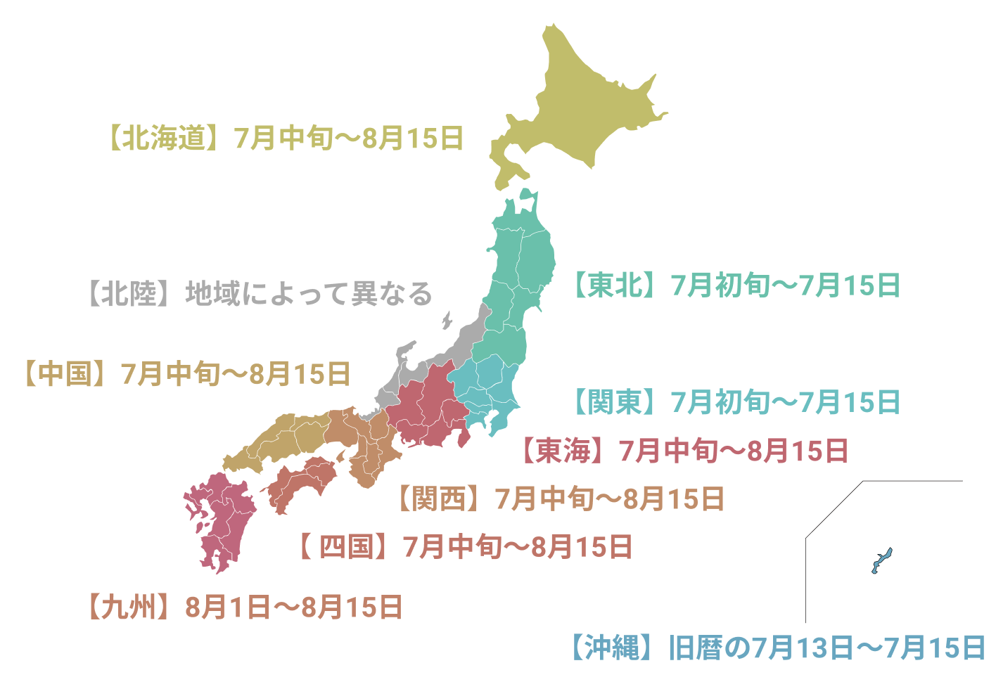 お中元を贈る時期は地域によって変わってきます。 自分たちが住んでいる地域とお相手のお中元の地域が違った、ということを防ぐためにも確認してから贈ると安心です。 首都圏:【7月上旬~15日ごろ】が本来の習慣。最近では【6月下旬から7月15日ごろ】に贈るところも多くなってきている。 北陸:【7月1日~15日ごろ】 北海道・東海・関西・中国・四国:【7月中旬~8月15日】 年々早まってきているので、7月15日ごろに届くようにしたら安心。 九州:【8月1日~8月15日】と最も遅い時期。九州では県で共通して時期が決まっている。ただ2週間しかお中元の時期がなく、お盆の時期と被るので注意。 沖縄:【旧暦7月13日~7月15日】の3日間がお中元の時期となる。いわゆる旧盆に当たる3日間なので、毎年日付が変わってくるため注意。この3日間に当たる日に届くように日付指定して贈る。