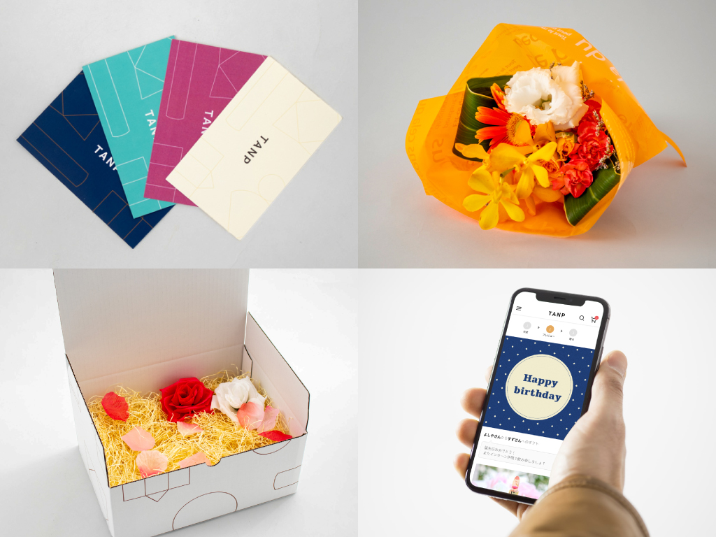 タンプでは有料でオプションをつけていただくと、ギフトをさらに彩ることができます。 ◆ダンボール装飾:480円 お届けする段ボールに花びらを散りばめ、開けた瞬間から特別な時間を演出します。 ◆お花の同梱:900円〜 ギフトと一緒に生のお花やプリザーブドフラワー、ドライフラワーを一緒に入れることができます。 贈り物にお花があるとお相手にも喜んでいただけます。 ◆メッセージカード:100円(無料あり) シーンにあわせたタンプ限定デザインのメッセージカードをご用意いたしました。 大切な方へのギフトに、ちょっと特別感のある演出を加えてみませんか?