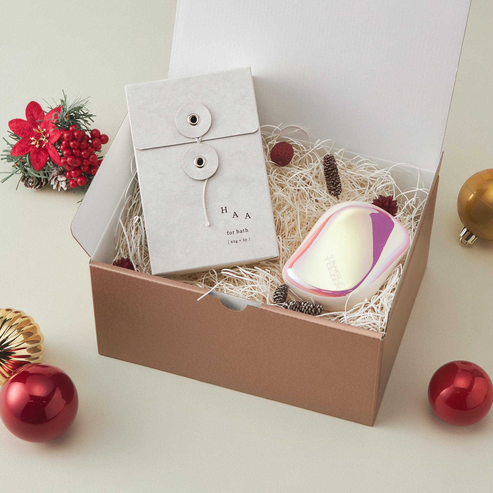 EMS電気刺激と温熱の最新テクノロジーで首回りを集中ケアできるネックケアと、自宅で天然温泉のような入浴が楽しめる「HAA for bath 小箱」のギフトセット。日頃の感謝を込めた贈り物にぴったりのお品です。2色から選べるクリスマスデザインのギフトボックスに入れてお届けします。