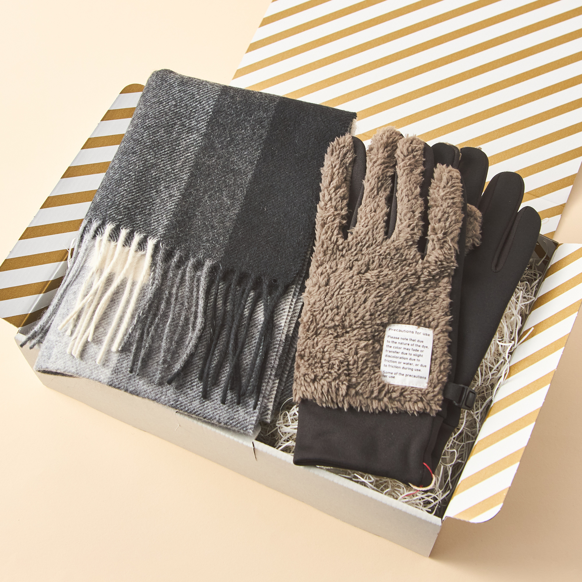 冬のギフトにぴったりなカシミヤ100%マフラーと、冷えをしっかりガードしつつスマホ操作も快適な手袋のギフトセット。