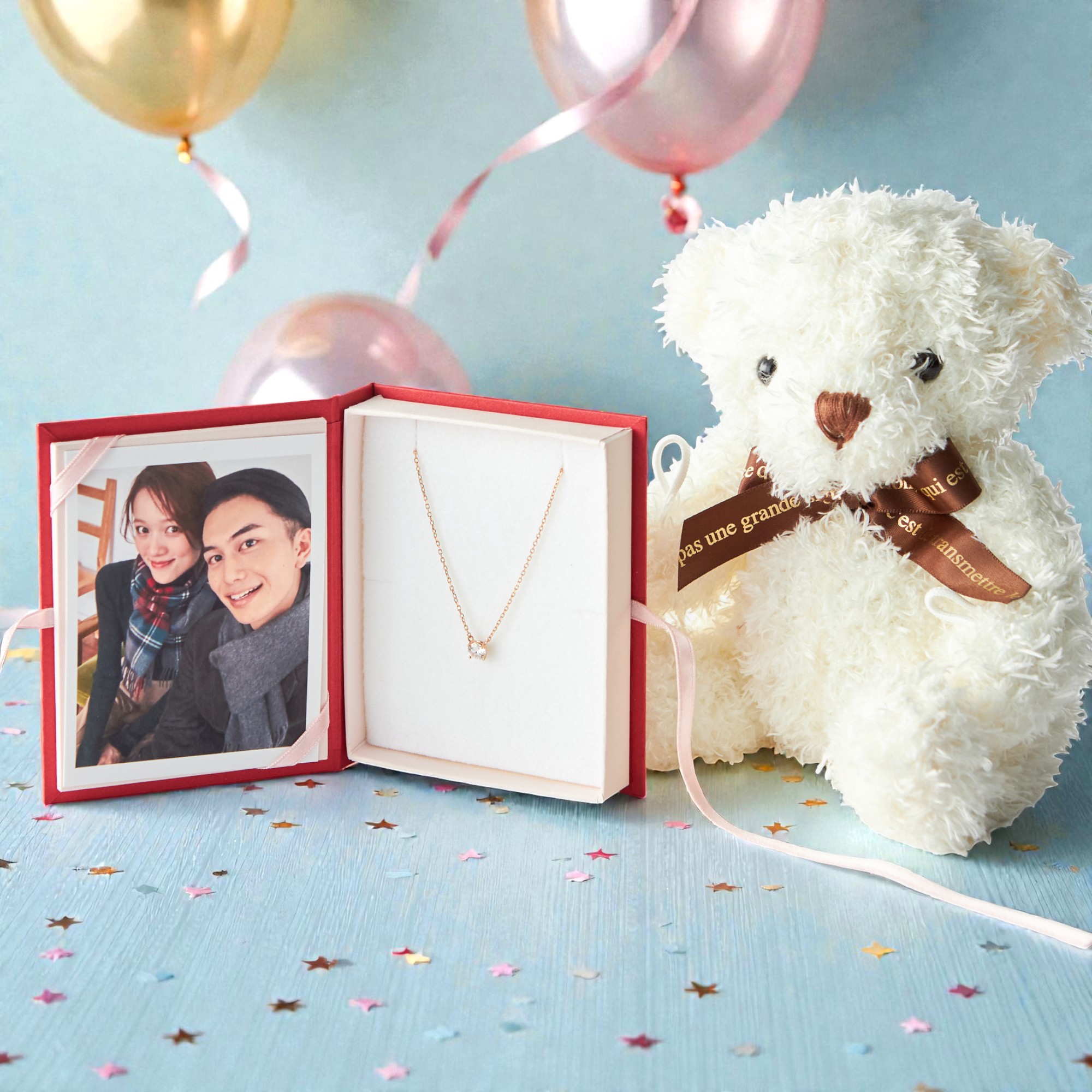【写真BOX付き】一粒ネックレス & テディベアギフトセット