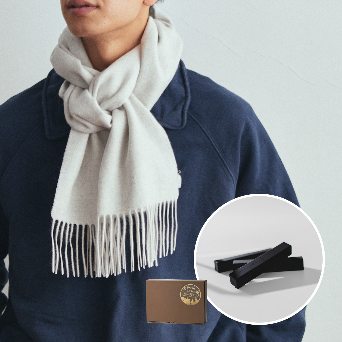冬のギフトにぴったりなカシミヤ100%無地マフラーと、EMS電気刺激と温熱の最新テクノロジーで首回りを集中ケアできるネックケアのギフトセット。