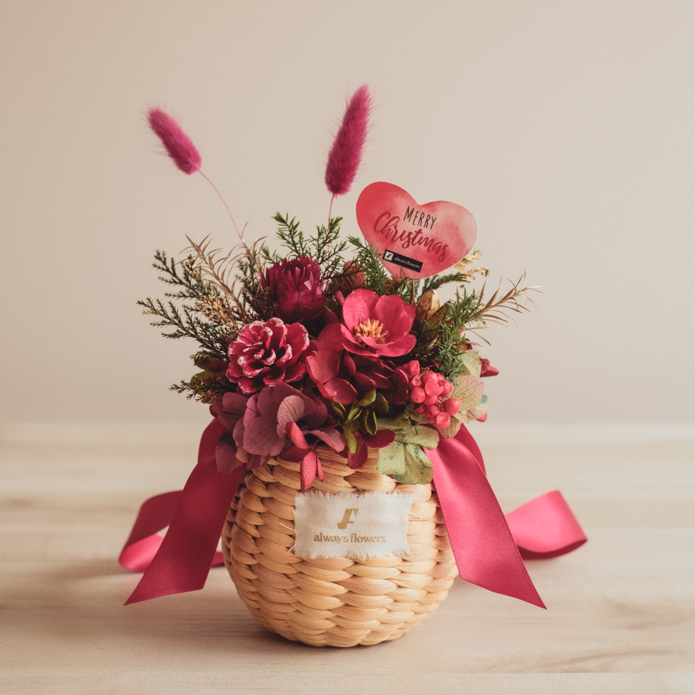 バラを中心としたクリスマスのメッセージ入りのプリザーブドフラワーブーケ。 生花に保存加工を施した色鮮やかなお花で、生花やドライフラワーに比べて数年間と長期間楽しめるのが特徴です。 ※ 一部花材が写真と異なる場合がございます。予めご了承ください。パッケージに入れてお届けします。 オプション価格:2,800円