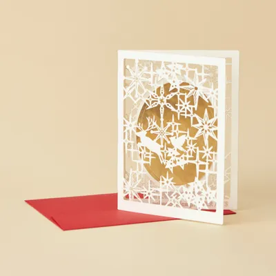 お部屋に飾れる立体切り絵カードを同梱いたします。 繊細な切り絵を使った、リースやトナカイ、鳥などがデザインされたクリスマスカードです。 「MerryChristmas」のメッセージ入りカード付きで、裏面に直筆メッセージをご記入いただけます。全て封筒に入れた状態でお届けいたします。 レッド・ゴールド・ホワイトの3色をご用意。 カラーによって絵柄の違いもお楽しみいただけます。 ※繊細なカットですので、強く引っ張ると破れます。レーザーカットのため変色が出る場合がございます。 オプション価格:最低価格935円〜