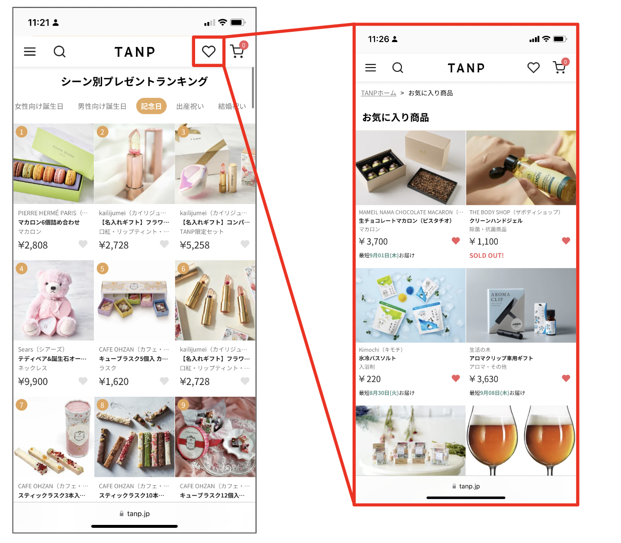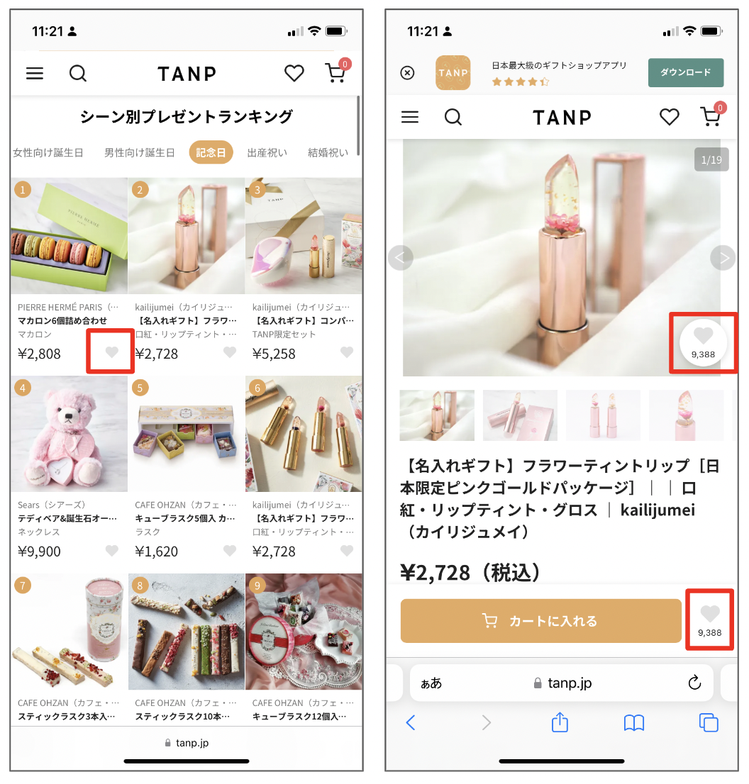 商品検索ページ、商品ページなどにある「ハートのお気に入りボタン」を押して、気になる商品をお気に入り登録してください。 5つ以上のお気に入りをお忘れなく!