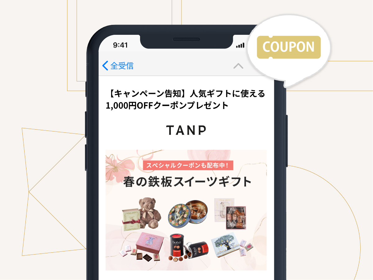 ■キャンペーン期間 2025年5月16日 0:00~2025年5月20日 23:59 ■特典 ・参加者全員に500円OFFクーポンをプレゼントいたします。 ※プレゼントのご案内については、会員登録時にご登録頂いているメールアドレス宛またはTANPサイト内のお知らせにてご連絡いたします。 ■キャンペーン対象 以下の条件をいずれも満たす方が対象となります。 1.TANPに会員登録いただいている方 2.キャンペーン期間中TANPでお気に入り商品を5つ登録された方 ※すでにお気に入り登録をされている商品については恐れ入りますが、対象期間中に再度お気に入り商品登録をお願いいたします。 ■注意事項 ※本キャンペーンについては、当社の都合により予告なく変更・終了させていただく場合がございます。 ※本キャンペーンへの応募やお問い合わせにかかるインターネット接続料や通信料等、一切の費用は、お客さまのご負担となります。 ※TANP会員でない方は、会員登録(無料)が必要です。 ※特典プレゼントまでにTANP会員を退会された方は対象外となります。 ※弊社が不正と判断した場合は、特典プレゼントの対象外となる場合がございます。 ※本キャンペーンのプレゼント対象者は、同時期に行われている他のキャンペーンの対象から除外、または景品総額が景品表示法上の範囲内に制限される場合がございます。 ■禁止事項 本キャンペーンへの応募にあたっては、以下の行為を禁止します。当社が禁止事項に該当すると判断した場合、応募や当選を無効にするほか、当社が必要と判断する措置を講じることができるものとし、応募者は当該措置に何ら不服を申し立てないものとします。 ・本規約に違反する行為 ・法令に違反する行為や犯罪行為に関連する行為、またはこれらを助長する行為 ・公序良俗に反する行為 ・当社または第三者の知的財産権、肖像権、プライバシーの権利、名誉、その他の権利または利益を侵害する行為 ・当社または第三者に不利益、損害、不快感を与える行為 ・当社または第三者を誹謗中傷し、またはその名誉や信用を毀損する行為 ・第三者になりすます行為 ・本キャンペーンの運営を妨げる行為、またはそのおそれのある行為 ・賞品の転売、譲渡、換金およびこれらを目的とする行為 ・その他、当社が不適切と判断する行為 ■本キャンペーンの変更、中断または終了について 当社は、以下のいずれかに該当する場合、予告なく本キャンペーンを変更、中断または終了(以下、変更等といいます。)することができるものとします。 ・本キャンペーンにかかるコンピューターやシステムの点検または保守作業を緊急に行う場合 ・コンピューター、通信回線等の障害、過度なアクセスの集中、不正アクセス、ハッキング等により本キャンペーンの実施、継続が困難となった場合 ・地震、落雷、火災等の天災地変、戦争、暴動、騒乱、労働争議等の不可抗力により本キャンペーンの実施、継続が困難となった場合 ・その他、当社が変更等を必要と判断した場合 ■免責 ・当社は、本キャンペーンを通じて提供する情報、賞品等の一切について、特定の目的への適合性、有用性、正確性、完全性、継続性等を含め、明示または黙示を問わず、いかなる保証も行わないものとします。 ・当社は、本キャンペーンの実施によって応募者等に損害を生じた場合、それが当社の故意または重過失に起因するものでない限り、一切の責任を負わないものとします。 本キャンペーンに関連して応募者と第三者との間で生じた紛争等については、応募者本人がそのすべての責任を負うものとし、当社は一切の責任を負わないものとします。 ■お問い合わせ先 本キャンペーンについてご不明な点等は、以下までご連絡ください。 キャンペーン事務局 【お問い合わせフォーム:https://tanp.jp/contacts】 受付時間:平日10時から17時まで 事務局設置期間:2025/5/16~2025/5/20 *お問い合わせを多数いただいている場合等、ご回答までにお時間をいただく可能性があります。 *受付時間外にいただいたお問い合わせにつきましては、翌営業日以降にご対応させていただきます。 *事務局のメールアドレスに使用しているドメイン「@tanp.jp」からのメールを受信できるように設定をお願いいたします。 ■分離可能性 本規約のいずれかの条項またはその一部が、消費者契約法その他の法令等により無効または執行不能と判断された場合であっても、その他の部分は、継続してその効力を有するものとします。 ■本規約の変更 当社は、当社が必要と認めた場合は、本規約を変更できるものとします。 ■準拠法- 裁判管轄 本キャンペーンに関する紛争等、一切の事項については日本法を準拠法とし、東京地方裁判所または東京簡易裁判所を第一審の専属的合意管轄裁判所とします。
