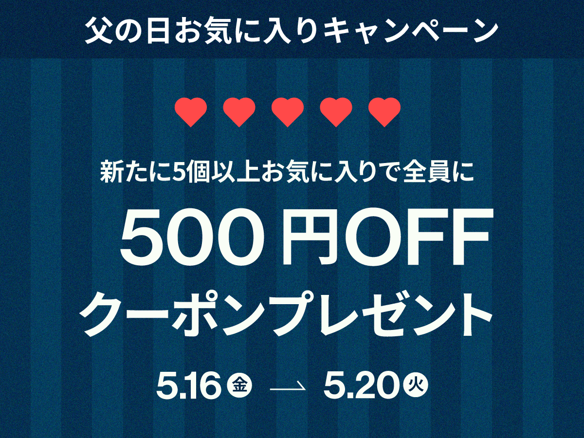5/16~5/20の期間中に新たにお気に入りを5つ登録いただいた方、全員に次回のお買い物で使える500円クーポンをプレゼント!クーポンで父の日のギフトをいつもより少し豪華にしませんか?