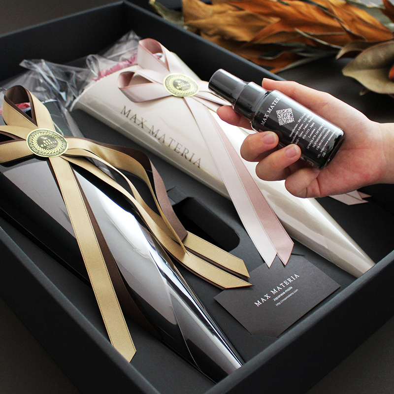 2種類から選べる辛口のスパークリングワインと、バッグのように持ち歩けるタンプ限定デザインのブリザードフラワーがセットになったオリジナルギフトセット。 レッドチェリーやコンポートのピーチの香りのロゼ、心安らぐグレープフルーツやレモンの香りのワインはどちらもスタイリッシュなボトルと味わいが魅力。 バッグのように持ち歩ける遊びゴコロたっぷりのフラワーアレンジメントは、ドライフラワーとプリザーブドフラワーで作っているので、お手入れも要らず長く楽しむことができます。 淡いピンクとラベンダーでまとまった色合いが、女性にはたまらない組み合わせ!