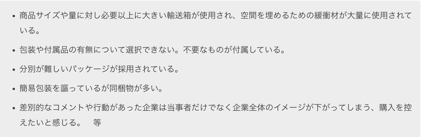 その他、SDGsやサステナビリティの観点で気になったこと、当社に限らず商品や企業のアクションでネガティブなイメージに繋がったことをヒアリングする項目では、全体の約50%が「特になし」の回答である中、約20%に当たる46名から「過剰包装」に関するコメントがありました。輸送時のダメージ軽減や食品におけるコロナ禍の対策等を考慮しても過剰だと感じたことがあるコメントがある一方、発送元で適切な対応を実現する為には更なる商品対応の細分化や、それに伴うオペレーションコスト増等のハードルを越える必要があることなどから、対応が追いついていない側面があることも想像されます。