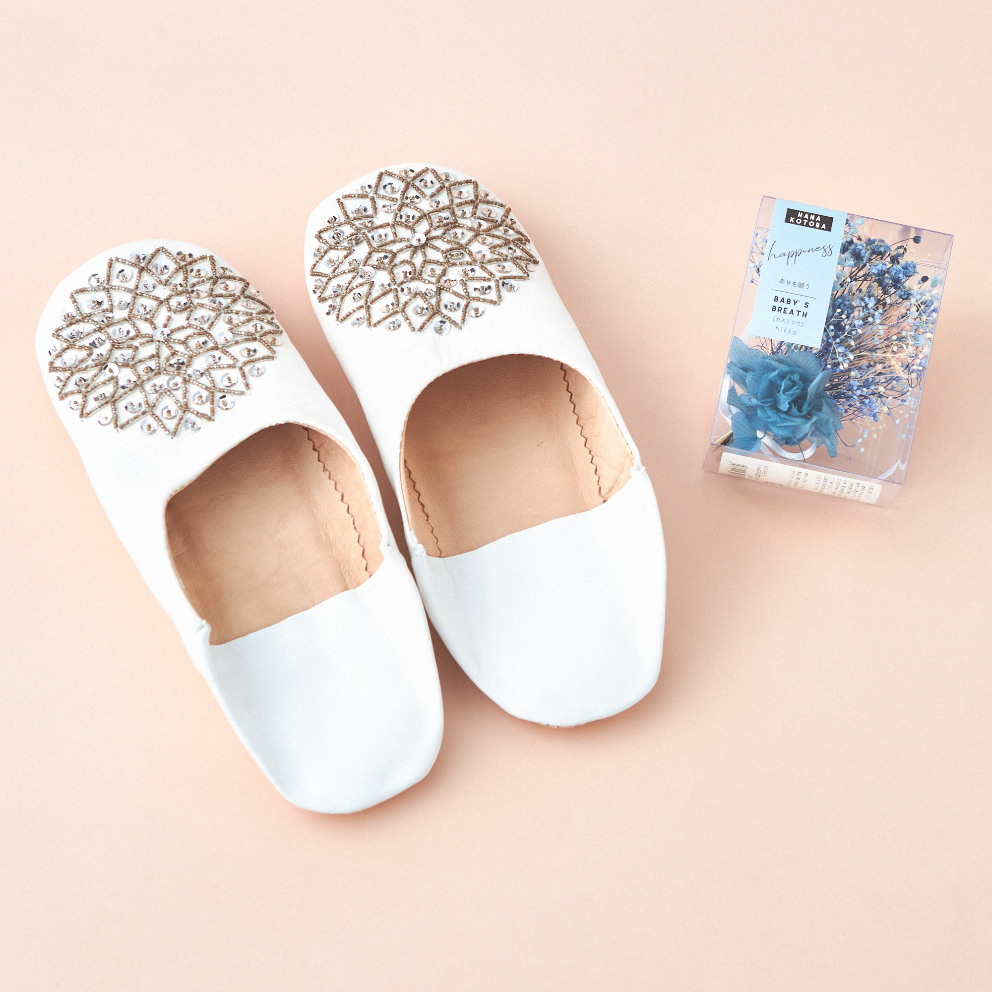 華やかなスリッパと花言葉ブーケのセット