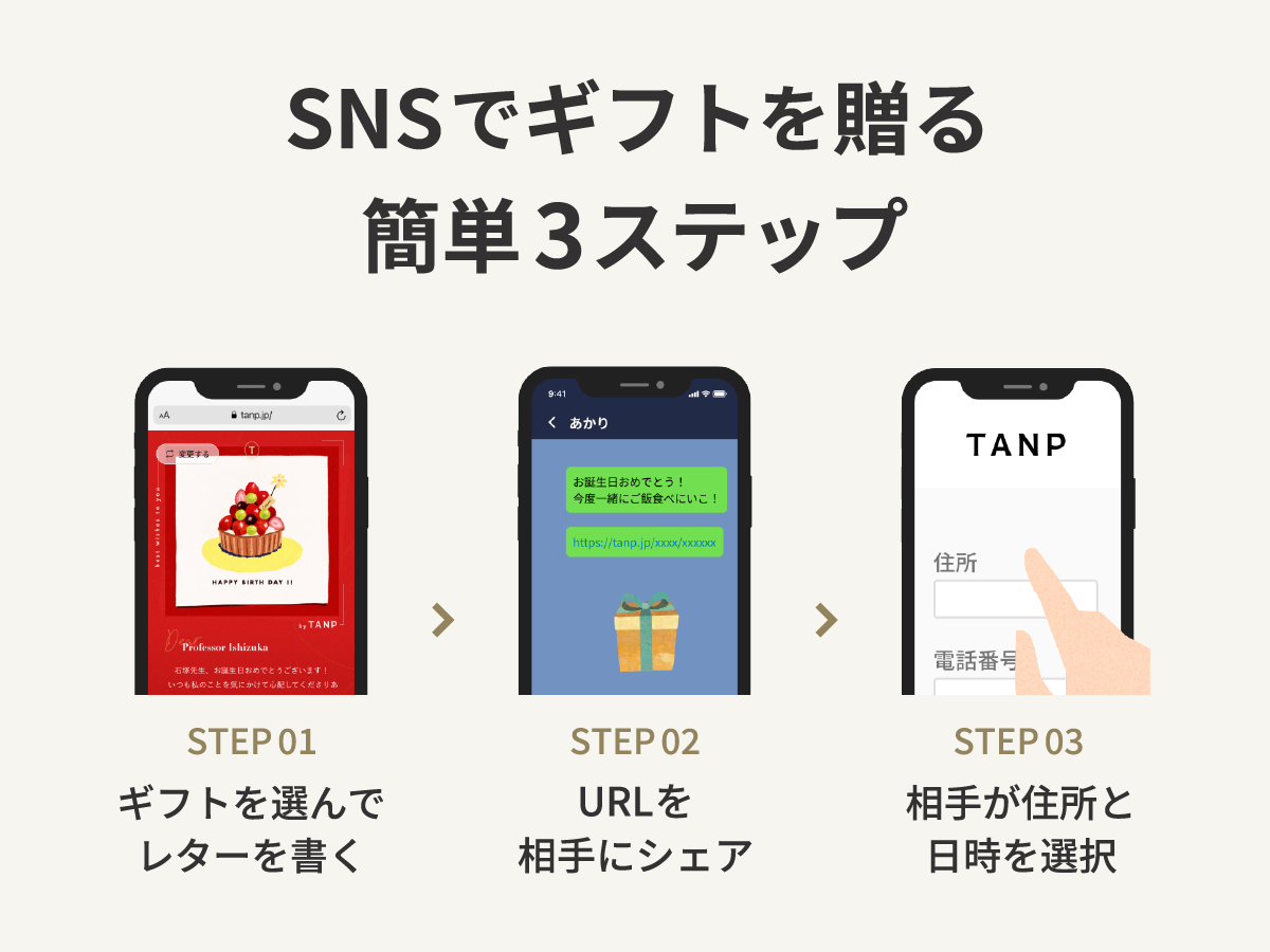 タンプでは「eギフト」機能を利用して、お相手に住所を入力してもらうことで配送先の住所を知らない場合でもギフトを贈ることができます。 お相手に住所を入力していただくことで、住所がわからずともギフトが送れるサービスは、個人情報を教えなくていいという点に加え、サプライズで贈り物をしたい時など相手に住所を聞くことなく配送できるのでとっても便利。 また、贈る相手との関係性からギフトを選ぶことができ、「相手の年代」や「値段」なども合わせて設定できるので、効率的に贈り物を探すことができます。最短、即日発送というスピード感も有難いですね! 今からでも大切な方に、春にぴったりのスイーツプレゼントを贈ってみませんか。