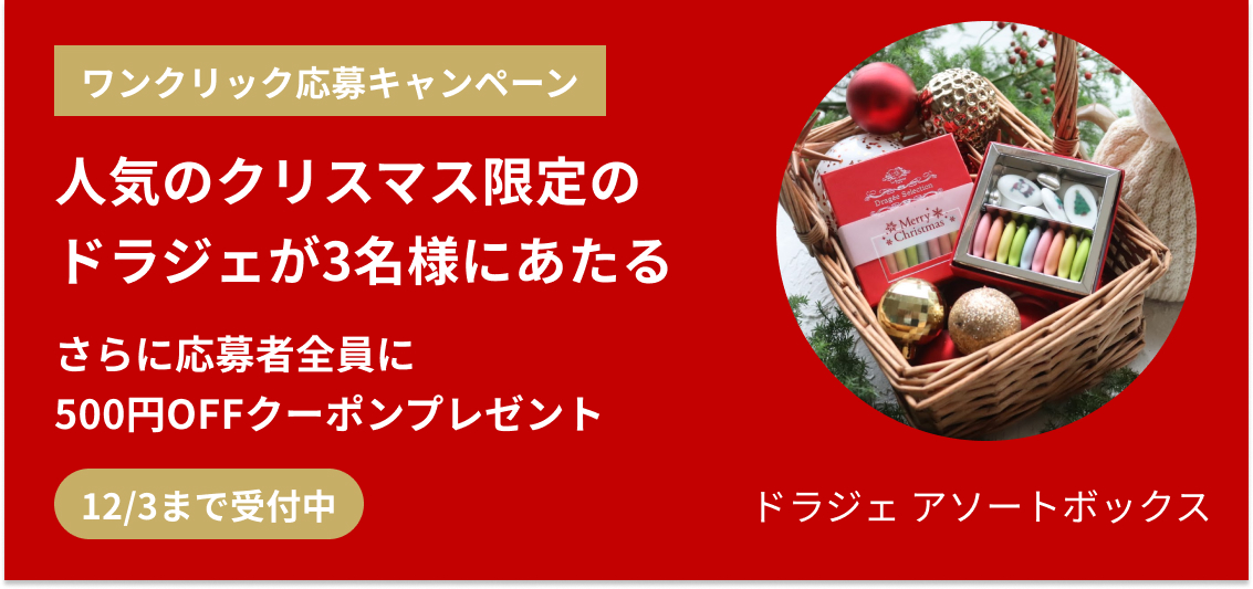 株式会社タンプ(以下、当社といいます。)が実施する「ワンクリック応募キャンペーン(以下、本キャンペーンといいます。)」へのご応募にあたっては、このキャンペーン応募規約(以下、本規約といいます。)に同意いただく必要がありますので、本規約をよくお読みいただいたうえで、本キャンペーンにご応募ください。 なお、本キャンペーンにご応募された方(以下、応募者といいます。)は、応募いただいた時点で本規約に同意いただいたものとみなします。 1、本キャンペーンの内容等について (1)応募期間 2025年12月1日(月)0:00〜12月3日(水)23:59まで (2)応募方法 以下①、②いずれもご対応いただくことで応募完了となります。 ①当社サービスへの会員登録 ②専用の応募ページにある「キャンペーンに応募する」ボタンをクリック (3)応募条件 ①TANPに会員登録いただいていること *同じ方からのご応募は1回に限ります。 *次の場合は、応募・当選が無効となりますので、ご注意ください。 TANPからのメールアドレスを受信しない設定とされている場合 応募後、退会された場合 ②日本国内にお住まいであること ③パソコンまたはスマートフォンからのご応募であること *当社の社員および関係者は応募できません。 (4)賞品・当選人数 「クリスマス限定ドラジェ(S)」を3名様。 *賞品の内容やデザイン等は、変更となる場合があります。 (5)抽選・当選発表 応募期間終了後、当社にて厳正な抽選を行い、当選者を決定します。 *抽選や当選に関わるお問い合わせは、一切お受けできかねますので、あらかじめご了承ください。 当選された方(以下、当選者といいます。)には、入会時に登録いただいているメールアドレス宛にご連絡します。 *メールを受信できるように設定をお願いします。 当選のご連絡は12月下旬頃を予定しておりますが、諸事情により前後することがありますので、あらかじめご了承ください。 (6)賞品の発送 当選者にメールで送付先情報の登録方法等をご案内します。 送付先情報をご登録いただけない場合、賞品の発送はできません。 *当選のご案内からお受け取り期限までにご登録がない場合、当選を無効とさせていただきます。 送付先は日本国内に限らせていただきます。 *日本国内であっても、一部の離島については発送できない場合がありますので、あらかじめご了承ください。 賞品のお届け日、お届け方法等はご指定いただけません。 ご登録いただいた送付先情報に虚偽または不備、誤りがある場合や長期不在等により賞品を送付できない場合、当選を無効とさせていただくことがあります。 送付先の情報が重複する等、同じ方が複数のアカウントを用いて応募されたと当社が判断する場合、当選を無効とさせていただくことがあります。 天災地変や賞品の生産上等の都合により、賞品内容の変更や賞品発送の遅れが生じる場合があります。 抽選による当選者決定ののち当選無効が生じた場合、再抽選は致しません。 無効となった当選が発生した場合、当選人数が記載の数に達しないことがあります。 2、当選者情報の取り扱いについて 当選者の情報は、当選等のご連絡や賞品の送付、応募資格等の確認のために利用します。 3、注意事項 本キャンペーンの内容については、当社の都合により予告なく変更させていただく場合があります。 本キャンペーンへの応募やお問い合わせにかかるインターネット接続料や通信料等、一切の費用は、お客さまのご負担となります。 当選者は、当選の権利を第三者(家族を含みます。)に譲渡し、または換金することはできません。 本キャンペーンと同時期に実施している他の当社キャンペーンには、重複して当選できない場合があります。 4、禁止事項 本キャンペーンへの応募にあたっては、以下の行為を禁止します。当社が禁止事項に該当すると判断した場合、応募や当選を無効にするほか、当社が必要と判断する措置を講じることができるものとし、応募者は当該措置に何ら不服を申し立てないものとします。 本規約に違反する行為 法令に違反する行為や犯罪行為に関連する行為、またはこれらを助長する行為 公序良俗に反する行為 当社または第三者の知的財産権、肖像権、プライバシーの権利、名誉、その他の権利または利益を侵害する行為 当社または第三者に不利益、損害、不快感を与える行為 当社または第三者を誹謗中傷し、またはその名誉や信用を毀損する行為 第三者になりすます行為 本キャンペーンの運営を妨げる行為、またはそのおそれのある行為 賞品の転売、譲渡、換金およびこれらを目的とする行為 その他、当社が不適切と判断する行為 5、本キャンペーンの変更、中断または終了について 当社は、以下のいずれかに該当する場合、予告なく本キャンペーンを変更、中断または終了(以下、変更等といいます。)することができるものとします。 本キャンペーンにかかるコンピューターやシステムの点検または保守作業を緊急に行う場合 コンピュー