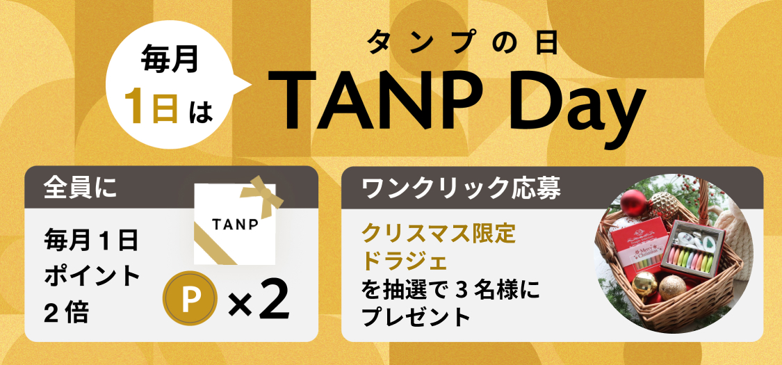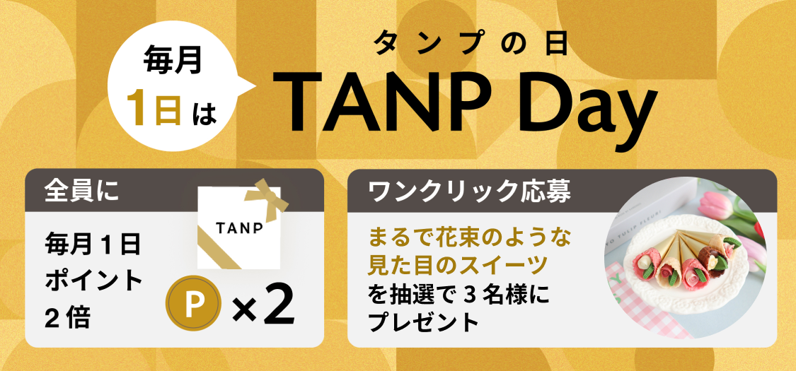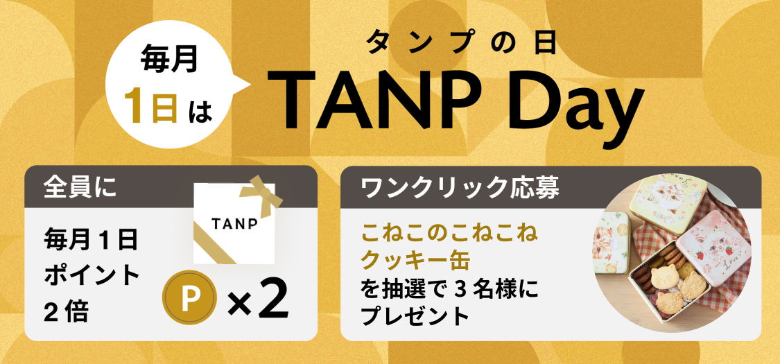 TANPの日がパワーアップ!日頃タンプをご利用いただいている皆様に感謝の気持ちを込めた特別なキャンペーンを実施いたします。タンプから皆様へ、皆様から大切な方へ、ギフトの輪を広げる月に一度の特別な日をお楽しみください。