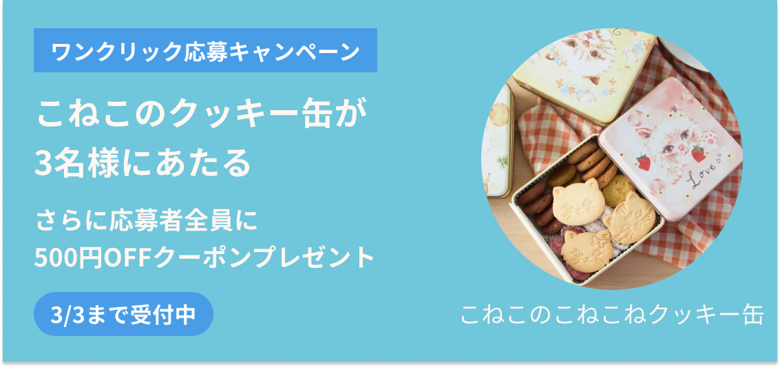株式会社タンプ(以下、当社といいます。)が実施する「ワンクリック応募キャンペーン(以下、本キャンペーンといいます。)」へのご応募にあたっては、このキャンペーン応募規約(以下、本規約といいます。)に同意いただく必要がありますので、本規約をよくお読みいただいたうえで、本キャンペーンにご応募ください。 なお、本キャンペーンにご応募された方(以下、応募者といいます。)は、応募いただいた時点で本規約に同意いただいたものとみなします。 1、本キャンペーンの内容等について (1)応募期間 2026年3月1日(日)0:00〜3月3日(火)23:59まで (2)応募方法 以下①、②いずれもご対応いただくことで応募完了となります。 ①当社サービスへの会員登録 ②専用の応募ページにある「キャンペーンに応募する」ボタンをクリック (3)応募条件 ①TANPに会員登録いただいていること *同じ方からのご応募は1回に限ります。 *次の場合は、応募・当選が無効となりますので、ご注意ください。 TANPからのメールアドレスを受信しない設定とされている場合 応募後、退会された場合 ②日本国内にお住まいであること ③パソコンまたはスマートフォンからのご応募であること *当社の社員および関係者は応募できません。 (4)賞品・当選人数 「こねこのこねこねクッキー缶」を3名様。 *賞品の内容やデザイン等は、変更となる場合があります。 (5)抽選・当選発表 応募期間終了後、当社にて厳正な抽選を行い、当選者を決定します。 *抽選や当選に関わるお問い合わせは、一切お受けできかねますので、あらかじめご了承ください。 当選された方(以下、当選者といいます。)には、入会時に登録いただいているメールアドレス宛にご連絡します。 *メールを受信できるように設定をお願いします。 当選のご連絡は3月下旬頃を予定しておりますが、諸事情により前後することがありますので、あらかじめご了承ください。 (6)賞品の発送 当選者にメールで送付先情報の登録方法等をご案内します。 送付先情報をご登録いただけない場合、賞品の発送はできません。 *当選のご案内からお受け取り期限までにご登録がない場合、当選を無効とさせていただきます。 送付先は日本国内に限らせていただきます。 *日本国内であっても、一部の離島については発送できない場合がありますので、あらかじめご了承ください。 賞品のお届け日、お届け方法等はご指定いただけません。 ご登録いただいた送付先情報に虚偽または不備、誤りがある場合や長期不在等により賞品を送付できない場合、当選を無効とさせていただくことがあります。 送付先の情報が重複する等、同じ方が複数のアカウントを用いて応募されたと当社が判断する場合、当選を無効とさせていただくことがあります。 天災地変や賞品の生産上等の都合により、賞品内容の変更や賞品発送の遅れが生じる場合があります。 抽選による当選者決定ののち当選無効が生じた場合、再抽選は致しません。 無効となった当選が発生した場合、当選人数が記載の数に達しないことがあります。 2、当選者情報の取り扱いについて 当選者の情報は、当選等のご連絡や賞品の送付、応募資格等の確認のために利用します。 3、注意事項 本キャンペーンの内容については、当社の都合により予告なく変更させていただく場合があります。 本キャンペーンへの応募やお問い合わせにかかるインターネット接続料や通信料等、一切の費用は、お客さまのご負担となります。 当選者は、当選の権利を第三者(家族を含みます。)に譲渡し、または換金することはできません。 本キャンペーンと同時期に実施している他の当社キャンペーンには、重複して当選できない場合があります。 4、禁止事項 本キャンペーンへの応募にあたっては、以下の行為を禁止します。当社が禁止事項に該当すると判断した場合、応募や当選を無効にするほか、当社が必要と判断する措置を講じることができるものとし、応募者は当該措置に何ら不服を申し立てないものとします。 本規約に違反する行為 法令に違反する行為や犯罪行為に関連する行為、またはこれらを助長する行為 公序良俗に反する行為 当社または第三者の知的財産権、肖像権、プライバシーの権利、名誉、その他の権利または利益を侵害する行為 当社または第三者に不利益、損害、不快感を与える行為 当社または第三者を誹謗中傷し、またはその名誉や信用を毀損する行為 第三者になりすます行為 本キャンペーンの運営を妨げる行為、またはそのおそれのある行為 賞品の転売、譲渡、換金およびこれらを目的とする行為 その他、当社が不適切と判断する行為 5、本キャンペーンの変更、中断または終了について 当社は、以下のいずれかに該当する場合、予告なく本キャンペーンを変更、中断または終了(以下、変更等といいます。)することができるものとします。 本キャンペーンにかかるコンピューターやシステムの点検または保守作業を緊急に行う場合 コンピュー