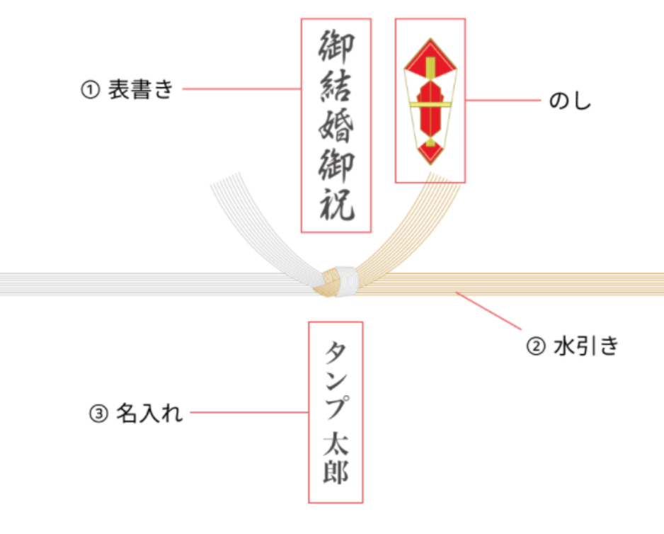 のしは、日本に古くから伝わる、贈り物に添える飾りのことです。 カジュアルなギフトシーンでは必須ではありませんが、フォーマルな場面での贈答品や目上の方への贈り物には、のしをつけるのが一般的な贈り方です。 のしはおもに4つの要素から構成されています。 ・のし のし紙の右上にある、六角形の飾りのこと。もとはあわびを薄くのしたもので、神仏に生ものをお供えする風習に由来しています。 ①表書き(名目) のし紙の上段中央にある、贈り物の目的についての記載のことです。 何を記載するかは、シーンによって使い分けが必要とされます。 別名を「名目」といい、のし紙の表側全体を「表書き」という場合もあります。 ②水引 のし紙の中央のひも飾りの印刷を指し、水引はシーンによって、結び方や色などに決まりがあります。 本来は包み紙が開かないように結ぶひもであり、簡易版であるのし紙にはそれが印刷されています。 ③名前書き(名入れ) のし紙の下段にある送り主の署名のことで、人数や贈り主によって書き方にルールがあります。 ※こちらに掲載されている写真は「結婚祝い」のときに用いるのしとなるので注意してくださいね。 「退職祝い」のギフトに用いるのしの表書きは「御礼」、水引は「紅白の蝶結び」が一般的です。