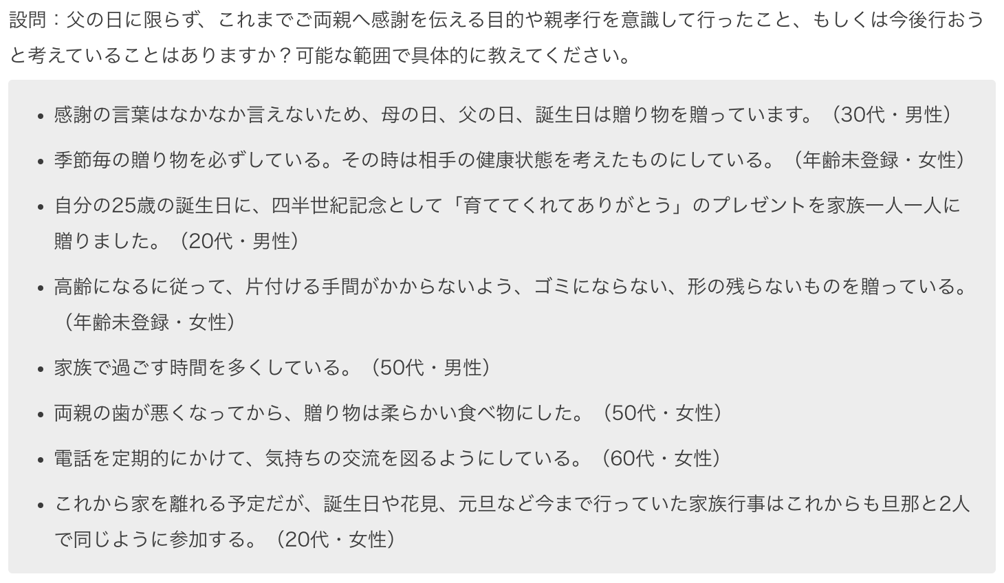 上記はコメントの一部ですが、特に「贈り物」に関する記述は多く、続いて「直接会う」「一緒に食事や旅行をする」「連絡を取る」といった内容が多く寄せられました。