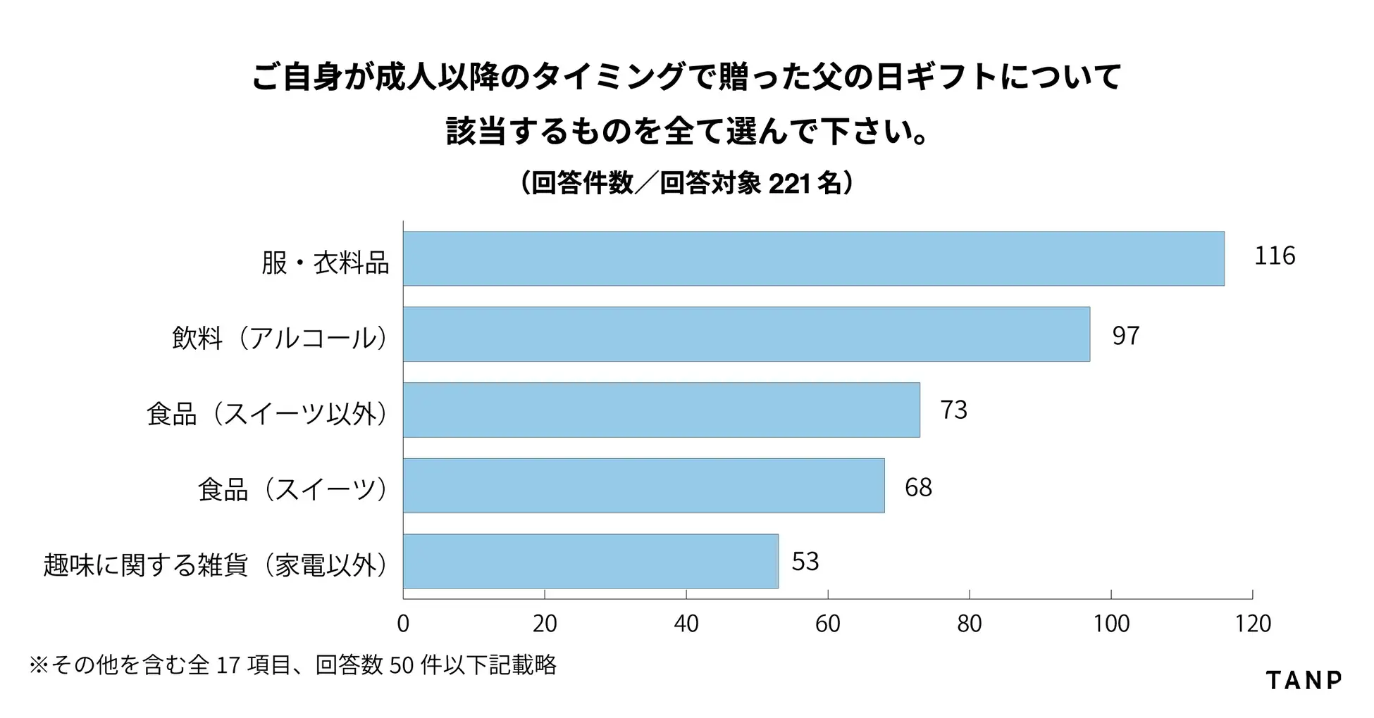 「成人以降に父の日ギフトを贈ったことがある」と回答した221名に対し、贈ったことのあるギフトカテゴリをヒアリングする設問では、それぞれ僅差でありながら「衣料品」「飲料」「食品」の3カテゴリが特に人気を集める結果となりました。母の日ギフトにおける「花」や「スイーツ」のようなアイコンがなく、より相手のライフスタイルや好みについて想像を求められる父の日のギフトは、やや「ご褒美性」に加え「実用性」の気色があるようにも感じられます。