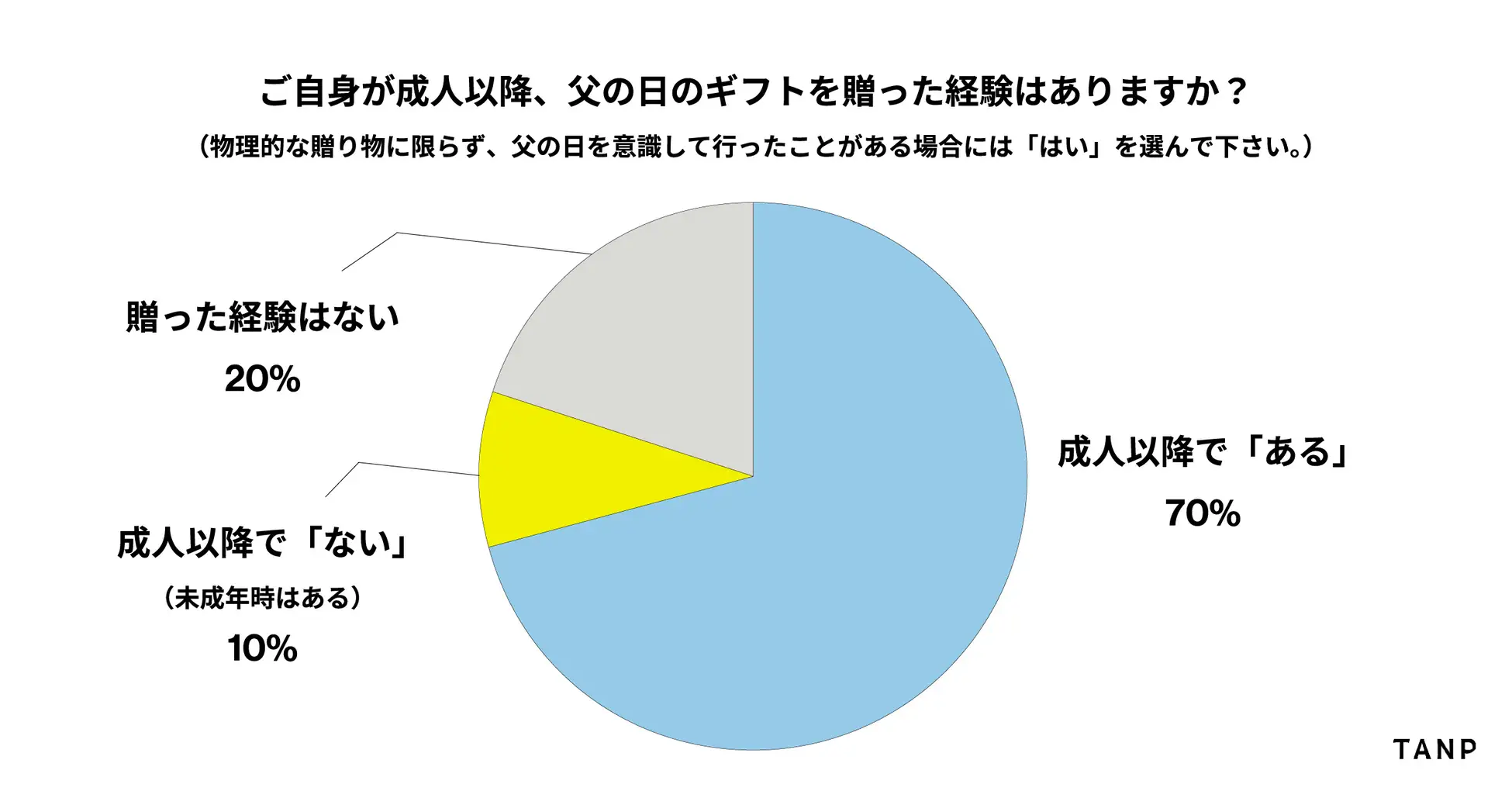 進学や就職、結婚など、歳を重ねるごとに両親と過ごす時間が少なくなってしまった方、多忙の中忘れがちになってしまい「父の日の思い出といえば子供の頃」という方もいらっしゃるのではないしょうか。本アンケートにて「自身が成人以降のタイミングで父の日のギフトを贈ったことがあるか」をヒアリングしたところ、そのような想像に反し、全体の約7割に当たる221名が「贈ったことがある」と回答。調査対象がタンプ会員である特性を持ちつつも、母の日に続き多くの方が両親への気持ちを伝える機会を大切にされていることが分かりました。