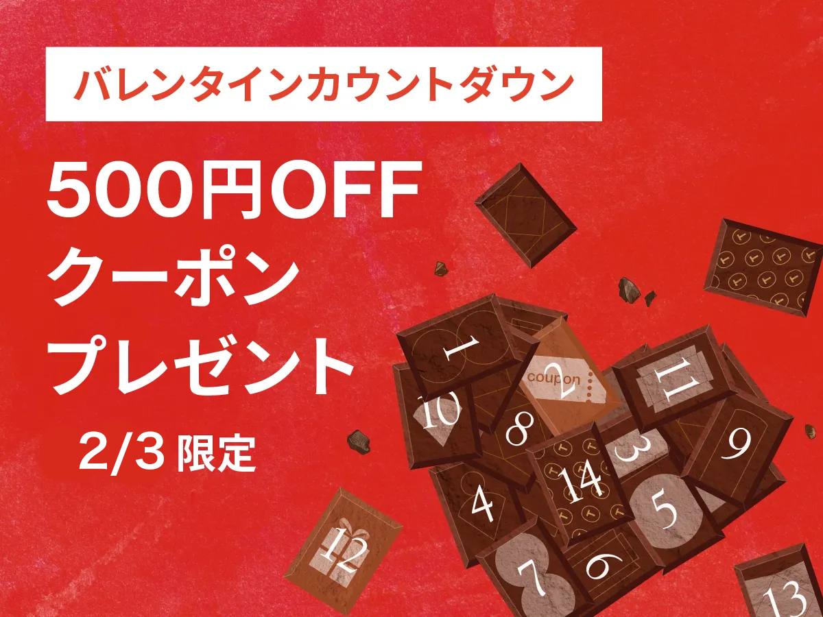 2/3はイベントDAY! 本日限定で、500円OFFクーポンをプレゼント! 大切な人へ、とっておきのバレンタインギフトを贈りませんか? クーポンは2/3(火)23:59までご利用いただけます。