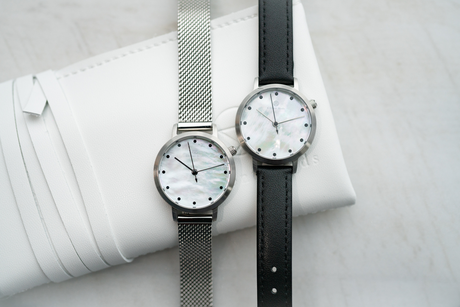 輝き方が一つ一つ異なる、マザーオブパール文字盤が特徴。ピンクのパールが虹色に輝き、女性らしい柔らかい印象を叶えます。ベルトにはブランドアイデンティティであるイタリアンレザーを使用。使い始めから馴染みの良く、なおかつ発色の良いレザーベルトです。