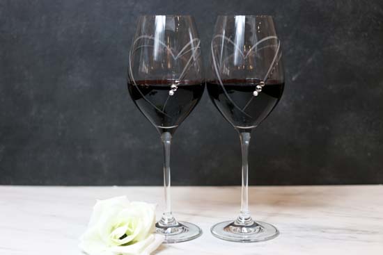 次に、ペアのワイングラスです。 グラス部分の側面にスワロフスキーもデザインされていて、こちらもそれぞれに両親のお名前もいれることができます。 また、底面にメッセージも入れられますよ。 印象的なプレゼントになりそうですね。