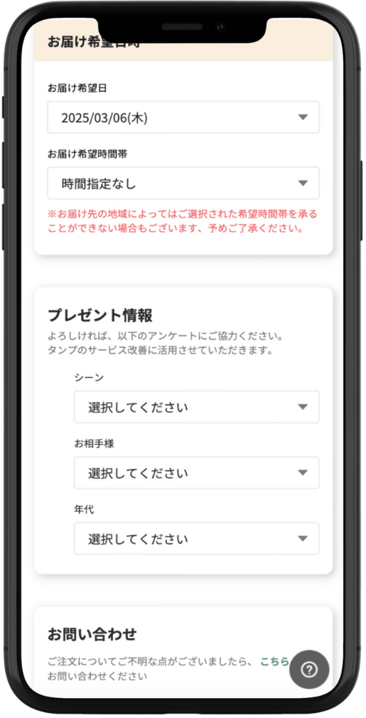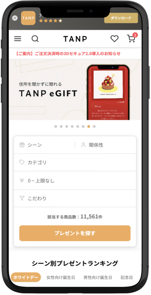 商品一覧から欲しいギフトを選んでください。 アプリの画面上部にある「検索窓」に商品の名前や関連する言葉を入力して探したり、シーン一覧から探すこともできます。