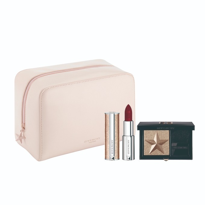 ジバンシイのコフレ、今年は3パターン。 第2弾淡いピンクの大人っぽいポーチに、ジバンシイ定番の星をモチーフにしたハイライト「ミスティック・グロウ・パウダー」と人気リップ「ルージュ・ジバンシイ」の限定カラー(ガーネット・イニシエ)がセットになっています。 パッケージがキラキラで「特別感」が演出されています♪