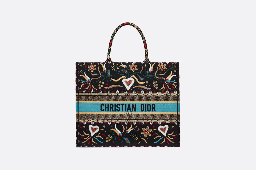世にも贅沢な「本を入れるためのバッグ」──。 一見ごくシンプルなようですが、製作工程にかかる時間と手間は、まさにスペシャル! 15~17時間もかける刺しゅうワークから生まれます。 着こなしを、一瞬にしてモードの領域に高める「迫力」の秘密は、こうした点にもあるのです。 マルチカラーの花とハートが刺繍されたキャンバス製“Dior Book Tote” バッグ。