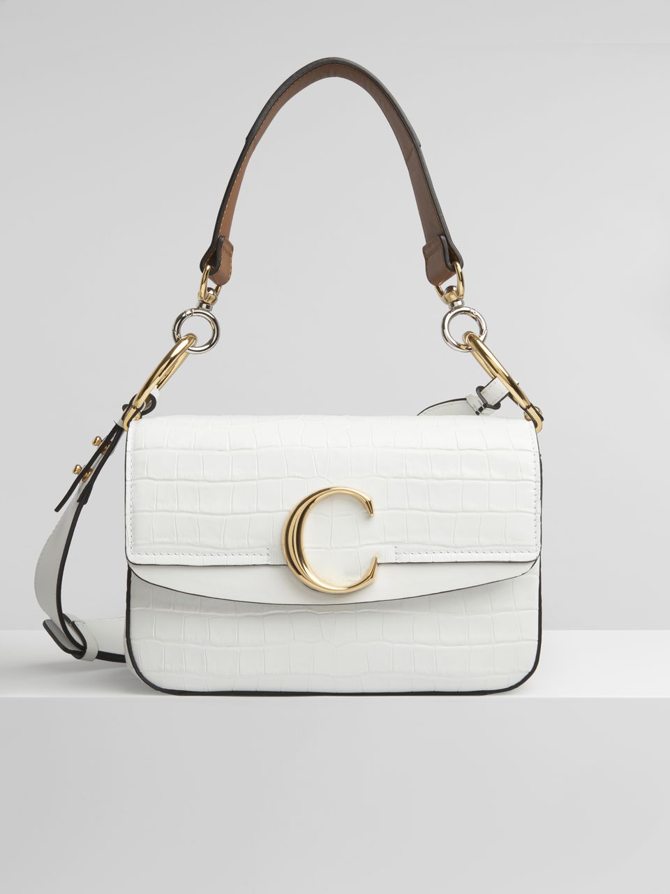 艶やかなデザインにレイヤードフラップとクロエを象徴するゴールドトーンの「C」が あしらわれています。 高級感のあるクロコダイル型押しカーフスキン、 マスキュリンとフェミニンの出会いから生まれた魅力、 がっちりしたレザーストラップに都会的な雰囲気が漂っています。 「Chloé “C”」の調節可能 & 取り外し可能なロングストラップで ショルダーとしてもクロスボディとしても使えるだけでなく、 幅広のショートレザーストラップでハンドキャリーとしても使うことができます。