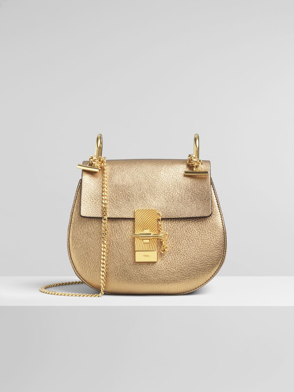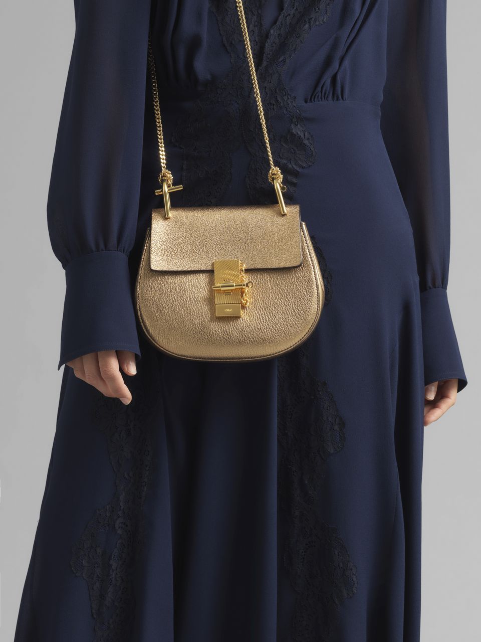 サイズを少し小さくしたコンパクトな「Drew」ミニショルダーバッグ。 デイタイムからイブニングシーンまで活躍するアクセサリーです。 女性らしいエレガンスさと現代的な魅力を際立たせるメタリックゴートスキンを使用。 シグネチャーのターンロックとチェーンディテールをあしらい、 メゾンのタイムレスな70年代の魅力を放っています。 ジュエリーのようなチェーンストラップでショルダーバッグとしても、 無造作に使えるクロスボディとしても使えるバッグです。