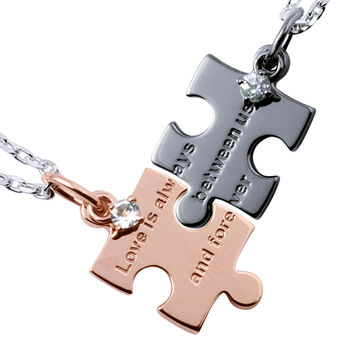 THE KISSのシルバーペアネックレス、パズルは二人のパズルがぴったり合って、そこにメッセージが出てくると言うもの。 男性用がシルバー、女性用がピンクゴールドのパズル。 そしてロイヤルブルームストーンがそれぞれのパズルに個性を与えます。 来年も二人でクリスマスを迎えられるように贈りましょう。