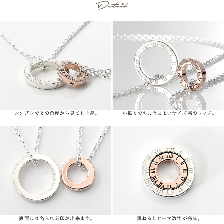 クリスマスプレゼントをチャンスに彼女との仲を確かなものにしたい。 あわせ文字ペアリングローマ数字は、二人のネックレスをあわせると12のローマ数字が綺麗に出てくるもの。 男性用のローマ字リングの中に、女性用のローマ字リングがぴったりと収まります。 チェーンの長さも選べるので、首元にリングを持ってくる、胸元まで下げるなど、思い思いの使い方が出来ます。 裏側に名前やメッセージを入れる事も出来るので、大切な人に贈るのにぴったりですね。