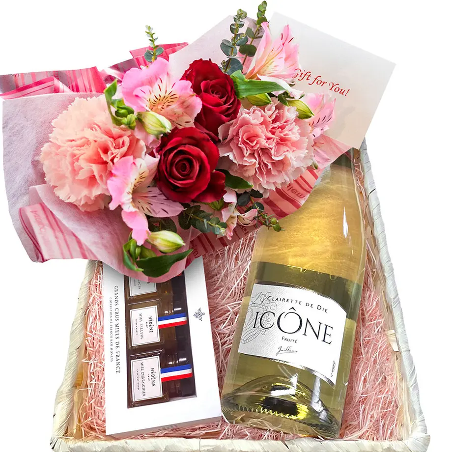 【花・ワイン・はちみつ】スパークリングワイン「クレレット・ド・ディー」&はちみつセット&バラとカーネーションのアレンジメント