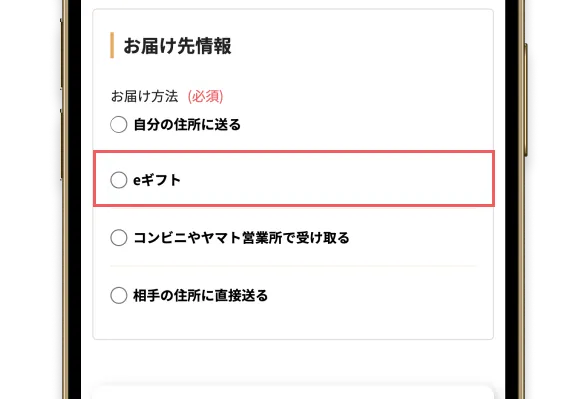 購入フォームにて、配送方法で『eギフト』を選択してください。