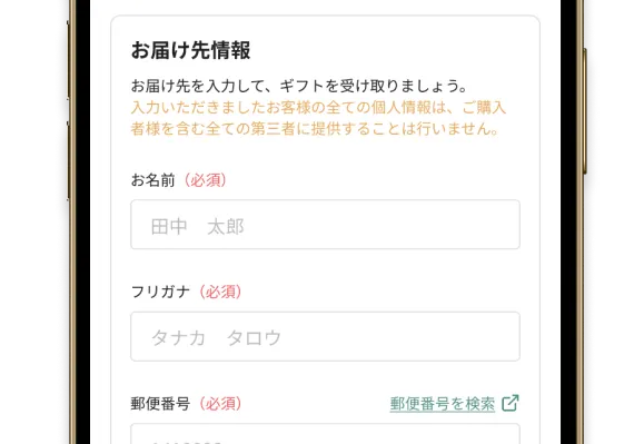 eギフトならシェアしたURLに、住所を入力してもらうことでギフトが贈れます。サプライズにも是非ご利用ください。