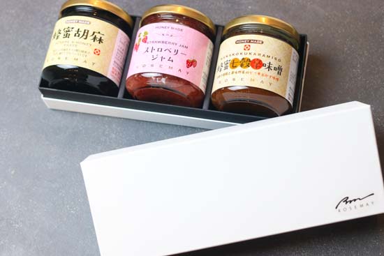 | 内容量 | 蜂蜜胡麻黒:210g ストロベリージャム:200g 蜂蜜七穀辛味噌:200g 各1個 |